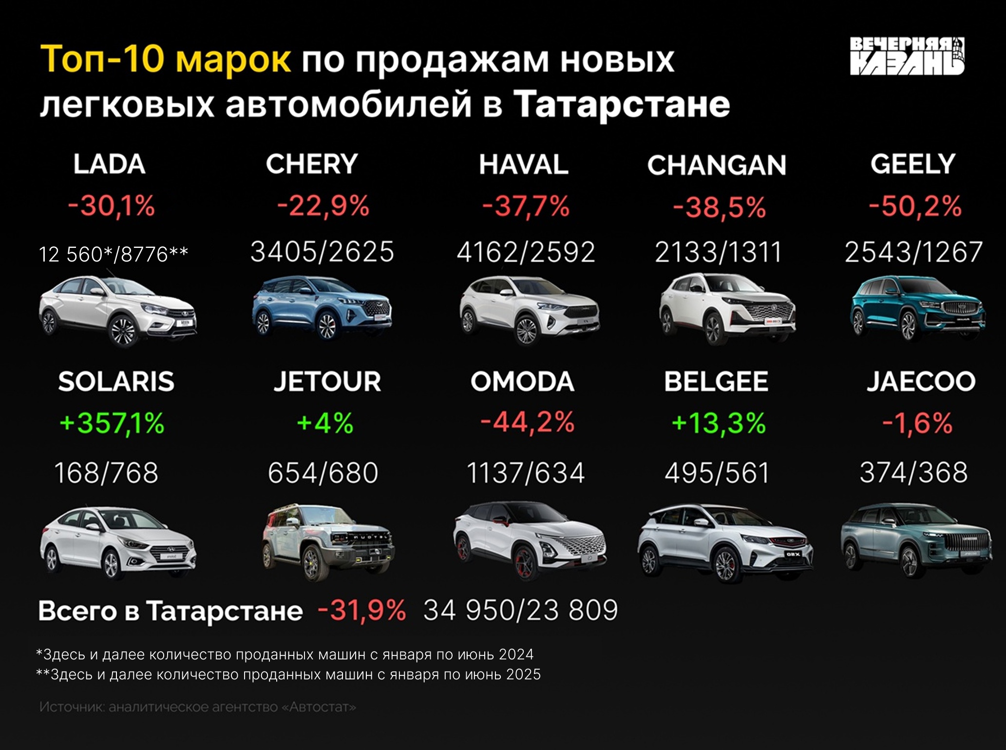А продажи Solaris подняли корпоративные закупщики и службы такси, отмечает директор компании «Твой автоэксперт» Павел Кузнецов. Он напомнил, что эта марка имеет несколько моделей, которые копируют бестселлеры бюджетного сегмента Hyundai Solaris, Kia Rio и Hyundai Greta. Что же касается продаж автомобилей в нашей республике, отметившихся еще большими отрицательными значениями, директор компании «Твой автоэксперт» объясняет их практичностью татарстанцев. Когда возникли хорошие предложения по покупке «железных коней», в основном китайских, они ими сразу же воспользовались.