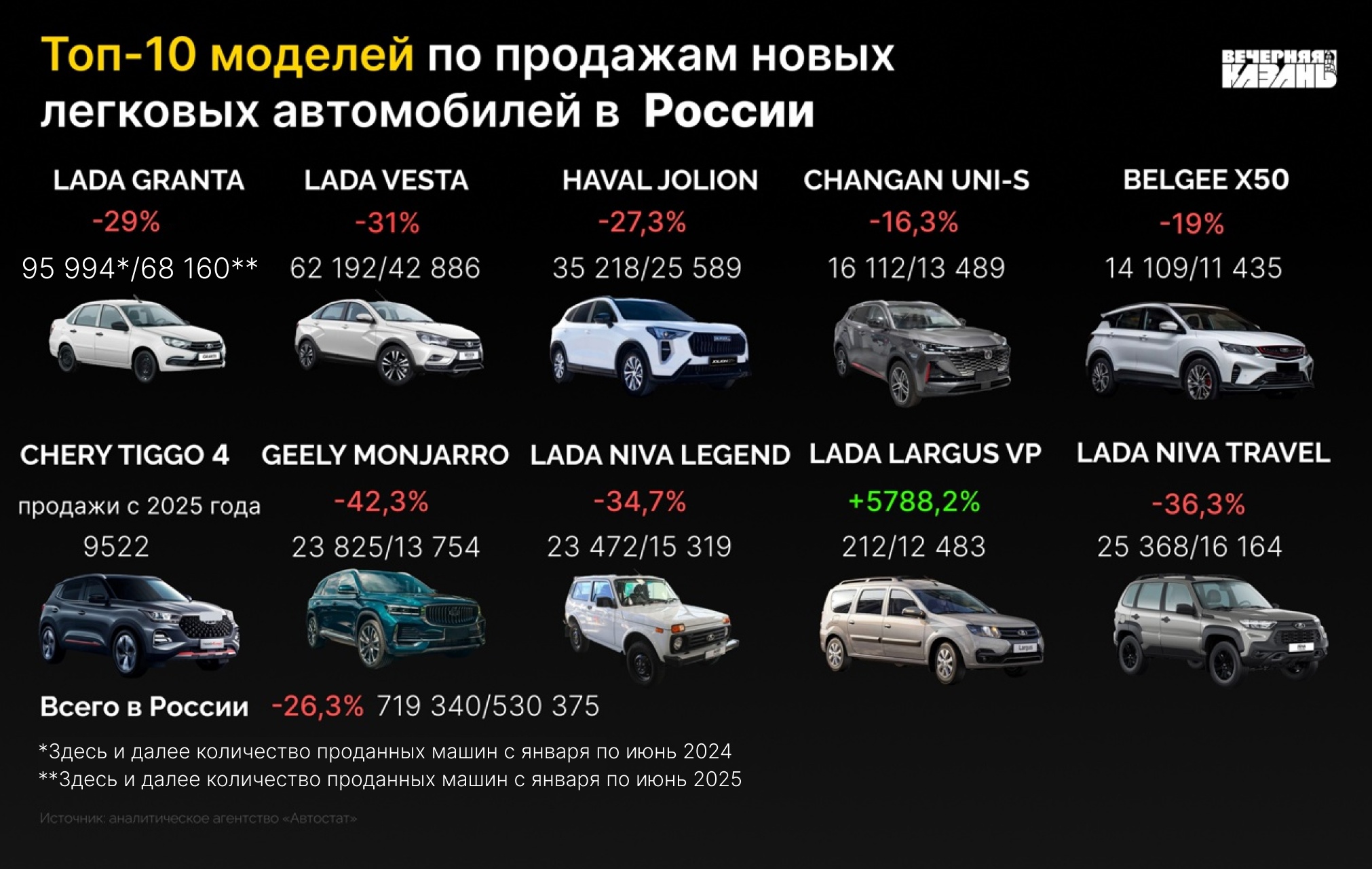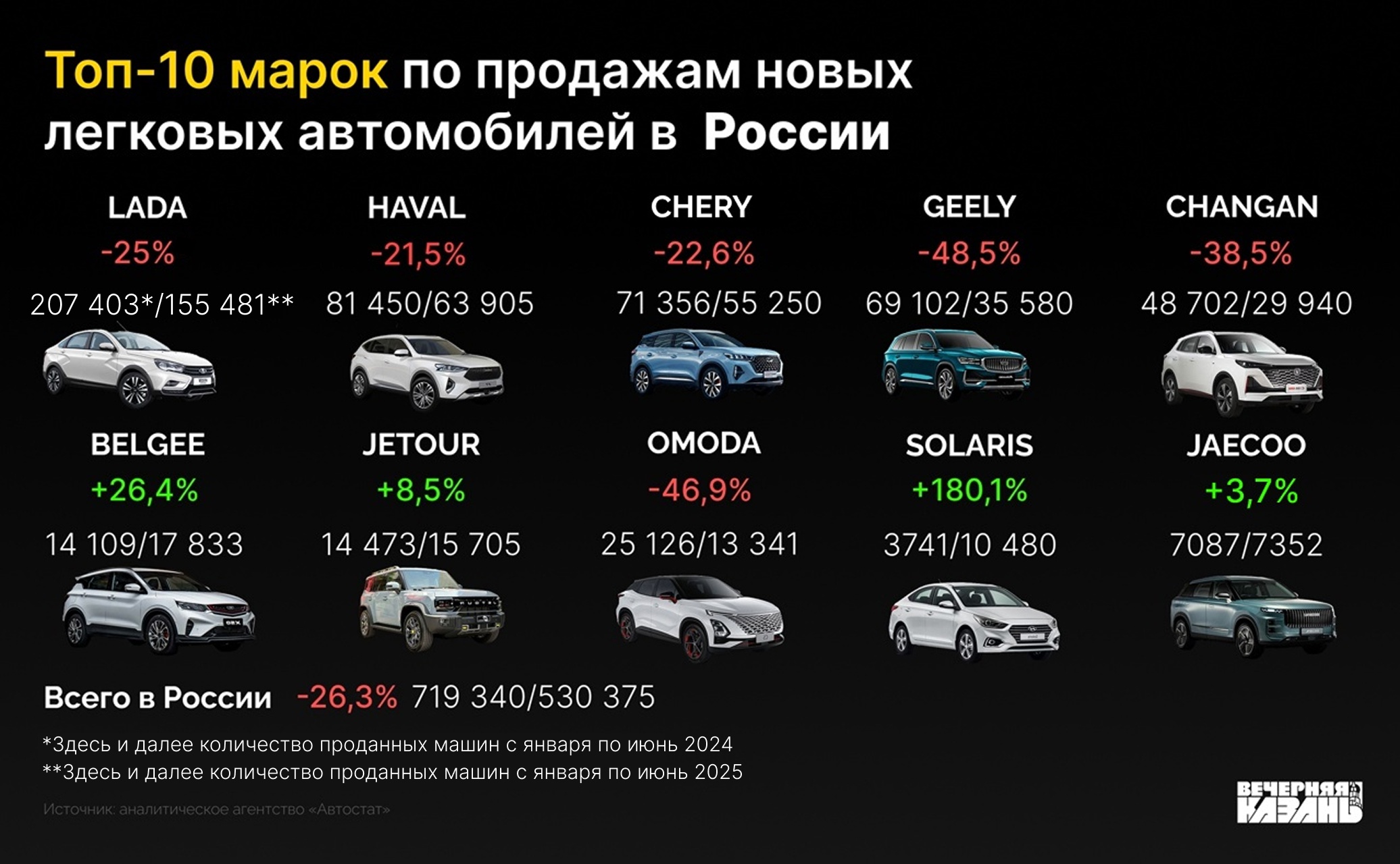 — Цифры говорят сами за себя: авторынок в упадке, — подводит итог основатель компании Kazandigital Олег Туманов. — Даже такие крупные игроки, как Chery, Geely, Haval и популярнейший Lixiang «просели» в продажах на 25-30 процентов и более. Одним словом, официальная статистика не дает повода для оптимизма.