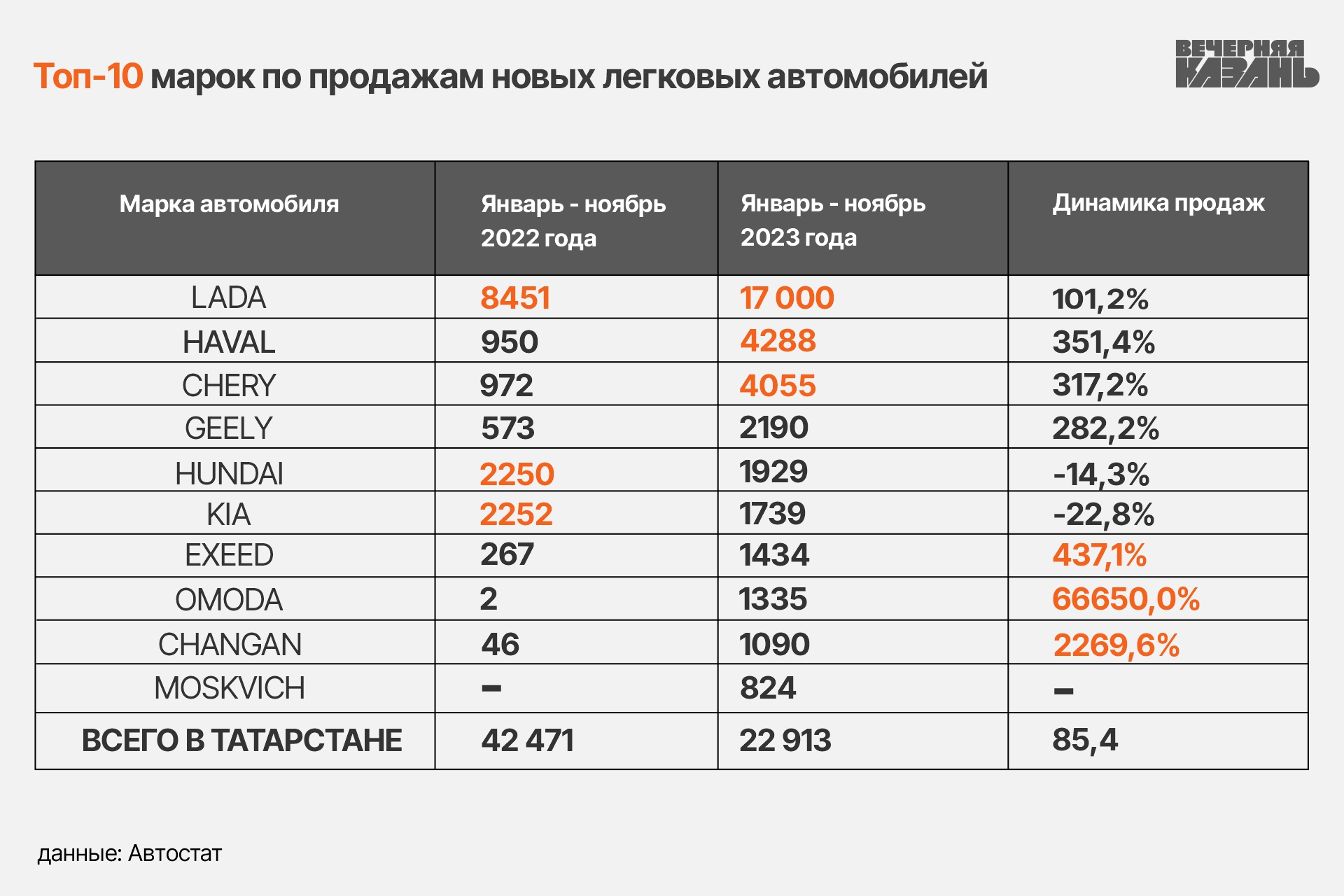 Самой популярной моделью среди новых автомобилей в Татарстане в 2023 году стала Lada, спрос на эту машину, по данным аналитического агентства «Автостат», вырос на 101,2%. Следующими по популярности стали автомобили китайских марок Haval и Chery — спрос на них в республике вырос более чем в 3 раза.