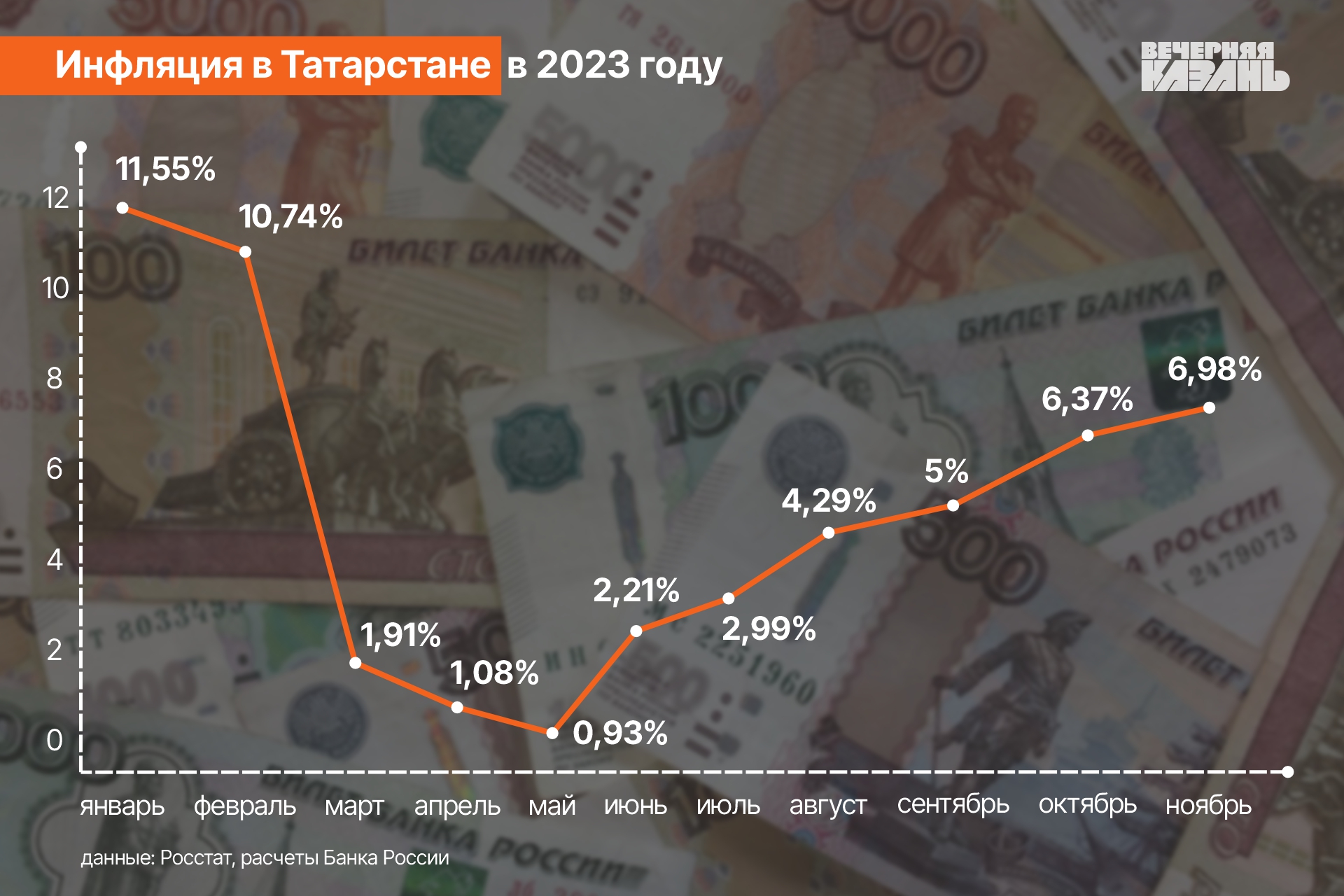 Годовая инфляция в Татарстане в ноябре разогналась до 6,98%. Еще в мае показатель составлял 0,93%. Рост цен в республике ускоряется шестой месяц подряд, хотя и остается ниже уровня инфляции по Приволжскому федеральному округу (7,19%) и в целом по России (7,48%).