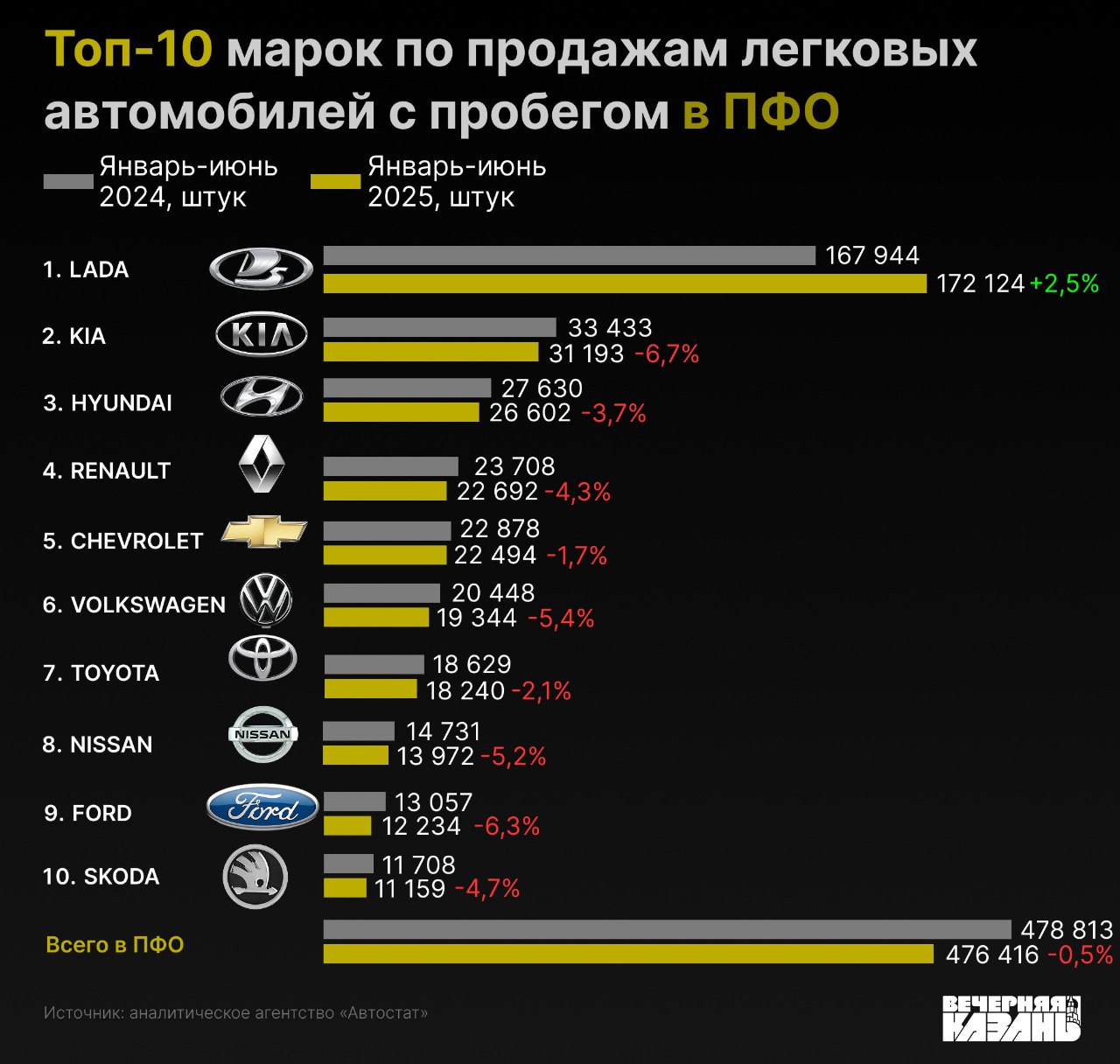 В ПФО и Татарстане первые три места у LADA, Kia и Hyundai. Кроме того, в нашей республике в первой десятке (8-е место) значится BMW. А вот к бренду Ford в регионе отношение, судя по всему, прохладное. Он даже не вошел в топ-10.