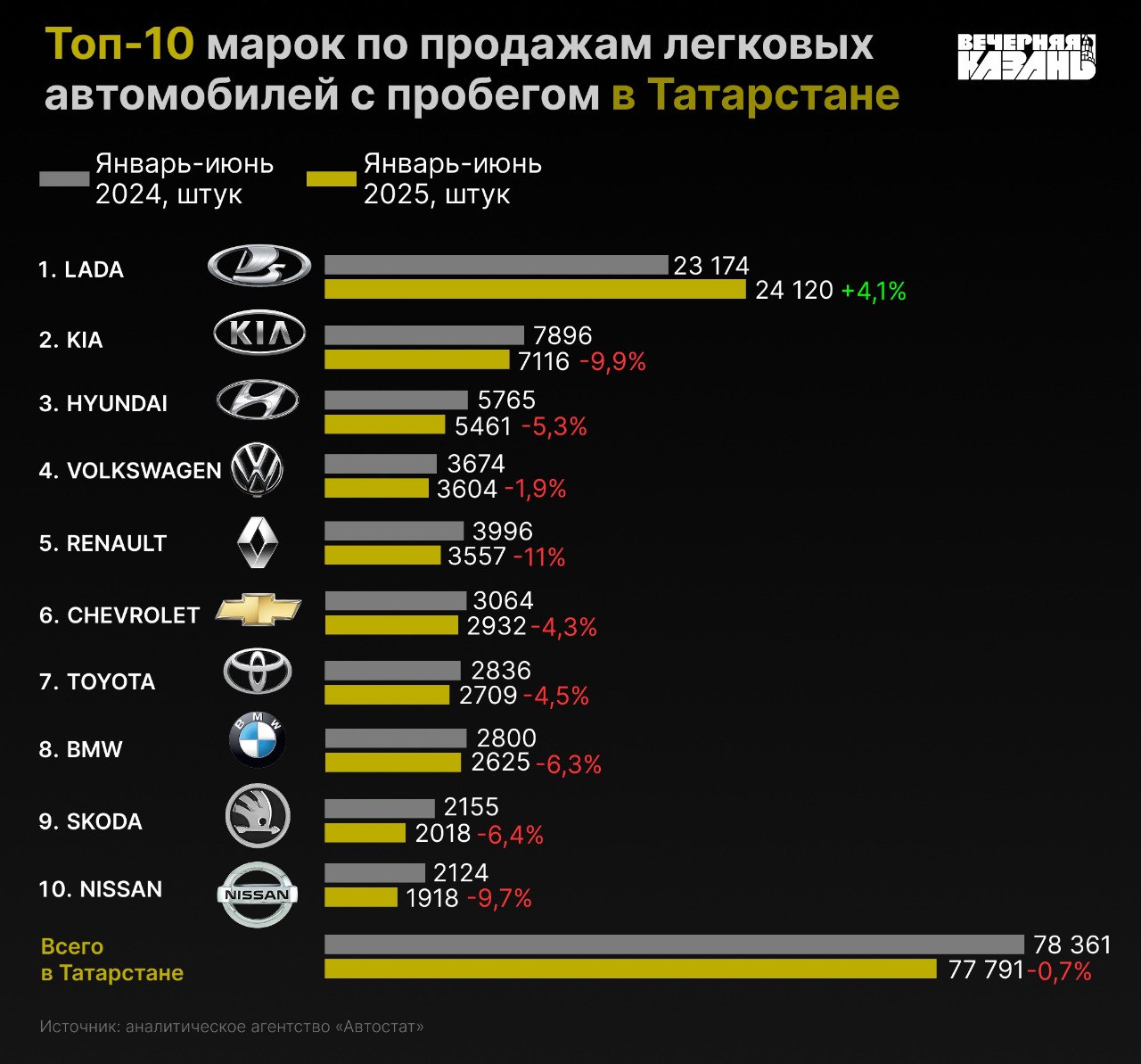 Собеседник издания полагает, что данные по востребованности марок по России и Татарстану «абсолютно между собой равны». Если где-то в региональной статистике подросли продажи, скажем, Volkswagen, это «могла быть какая-то крупная сделка или же перерегистрация. Например, при изъятии парка машин».