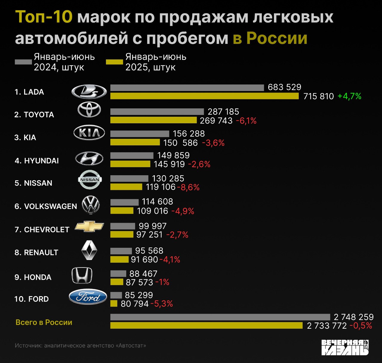 На рынке автомобилей с пробегом в России удерживает первенство LADA. В первом полугодии наши соотечественники приобрели 715 810 машин этой марки — на 4,7% больше, чем в январе-июне 2024 года. На второй строчке расположилась японская Toyota. Ее отрыв от лидера, по понятным причинам, ощутим: более чем в 2,5 раза.