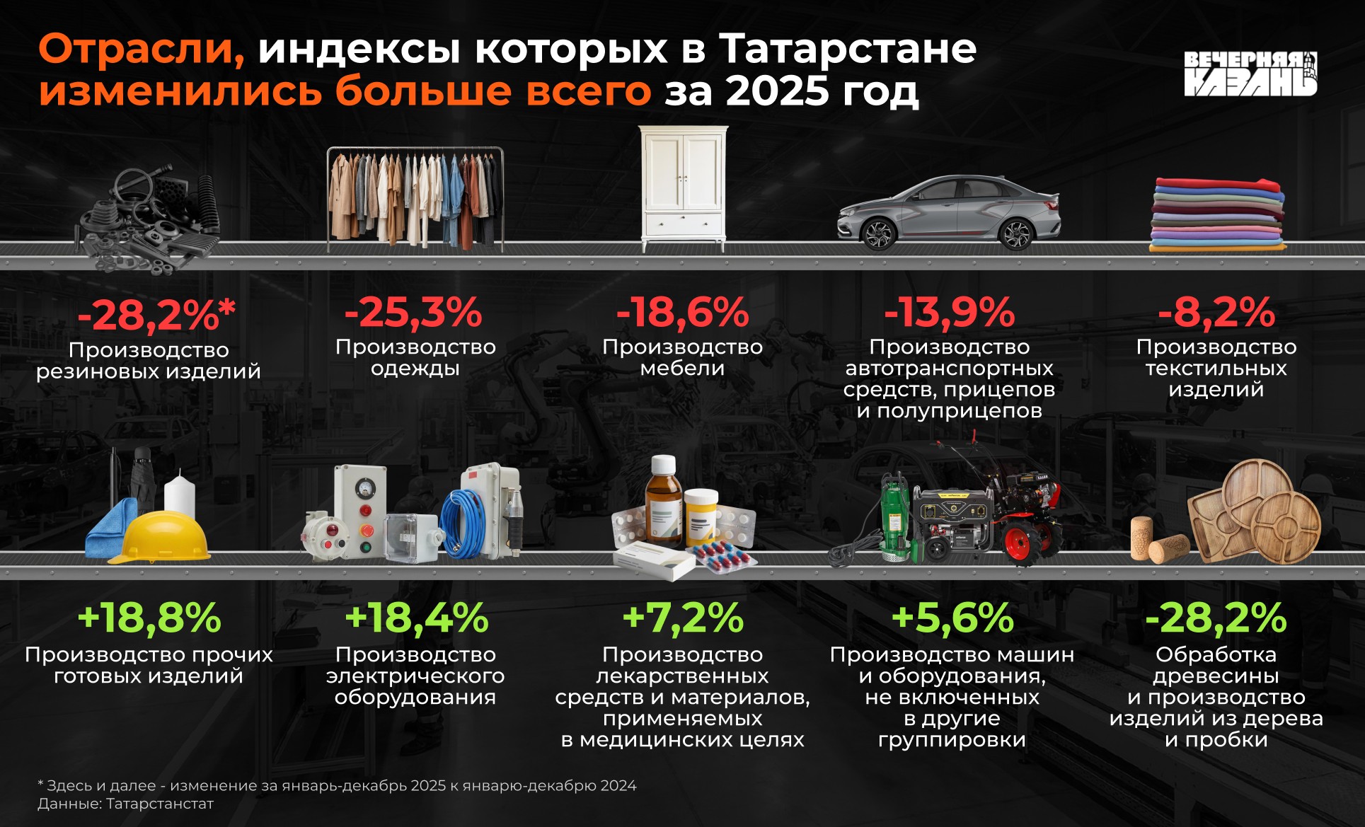 Промышленное производство в Татарстане по итогам 2025 года выросло на 9,9%, что больше, чем в 2024 году, когда показатель прирос на 6,1%. Такие итоговые данные в отчете социально-экономического развития республики представил Татарстанстат. Развитие промышленности республики опережает общероссийские темпы — в целом по стране производство выросло на скромные 1,3%.