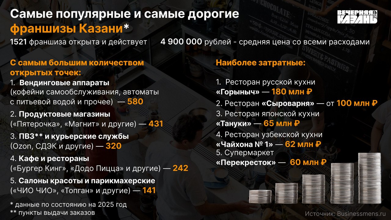 В Казани вне конкуренции — вендинговые аппараты: с питьевой водой, кофейни самообслуживания и тому подобное. Они опередили даже франшизы таких распространенных продуктовых магазинов, как «Пятерочка» и «Магнит».