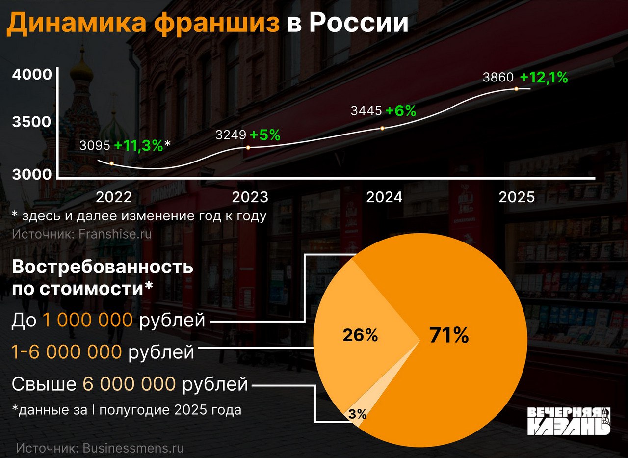 В то же время растёт спрос на франшизы с вложениями от 500 тысяч до миллиона рублей и выше. По мнению собеседника издания, это говорит о том, что инвесторы стали более зрелыми: «Они ищут не просто «бизнес за деньги», а устойчивую, масштабируемую модель с чёткой стратегией развития».