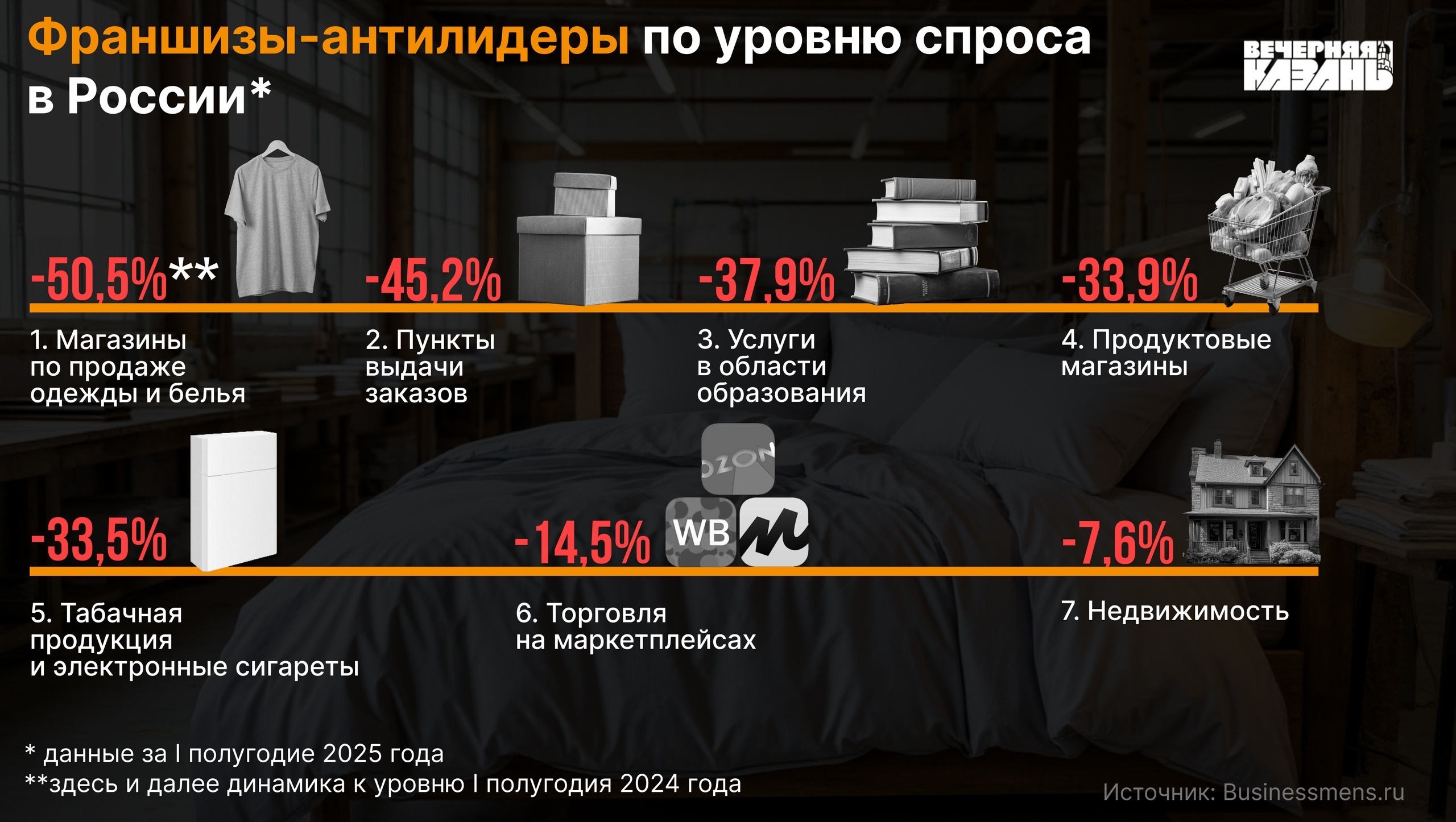 Помимо прочего, за последние шесть месяцев интересы инвесторов сместились в иные ниши. В 2024 году были крайне популярны открытия пунктов выдачи заказов. Ныне они уже не столь актуальны. Охладели инвесторы и к образовательным услугам. Хотя детское образование показывает даже прирост. Например, школы программирования. Снизилась востребованность франшиз на рынке недвижимости – сыграла роль недоступность кредитов.