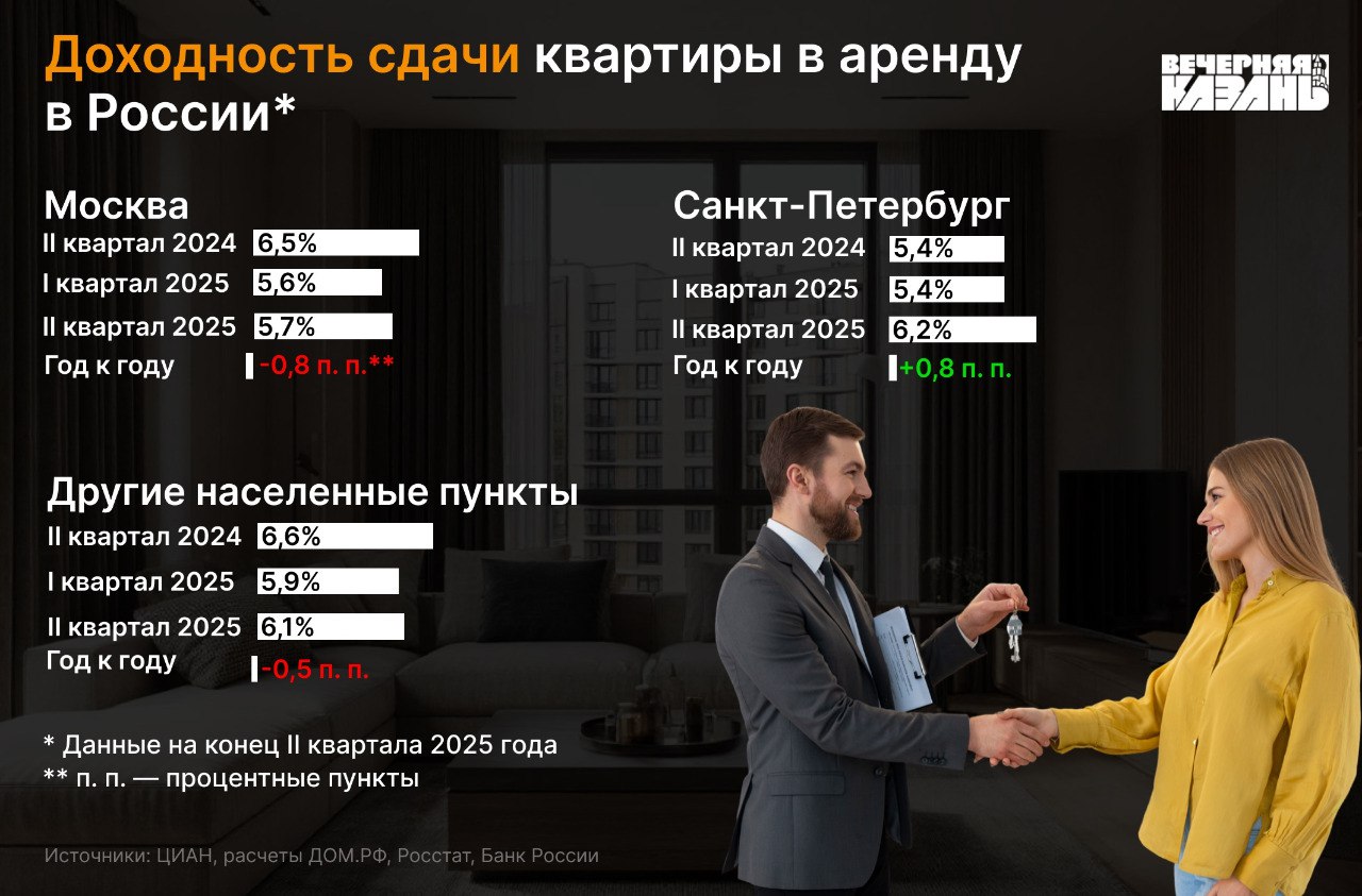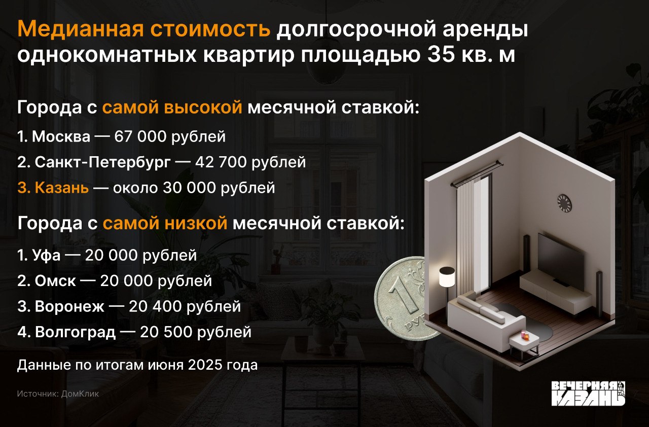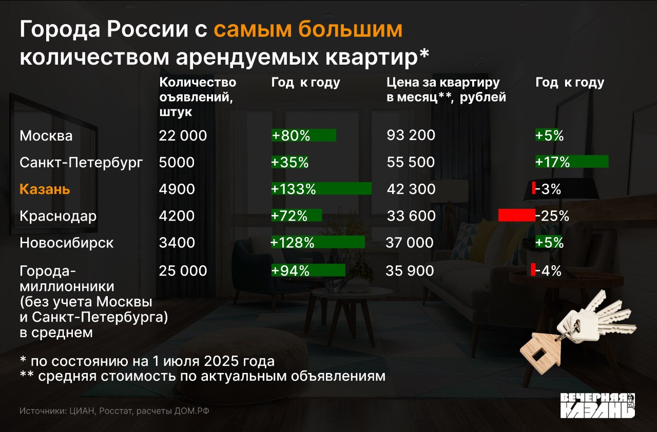 Кроме того, в июне 2025 года в большинстве городов-миллионников России, подсчитали аналитики «Домклик», подросли цены на долгосрочную аренду жилья. Казань выделилась и тут. Сервис «Яндекс.Аренда» сообщил, что наш город стал единственным среди себе равных, где стоимость аренды квартир, напротив, понизилась. В частности, она уменьшилась на 4,7%, опустившись до 44 тысяч рублей. У всех остальных российских городов-миллионников она выросла на 2,4%, достигнув 35 тысяч рублей за среднюю квартиру. То есть разрыв с Казанью у них все еще ощутим.