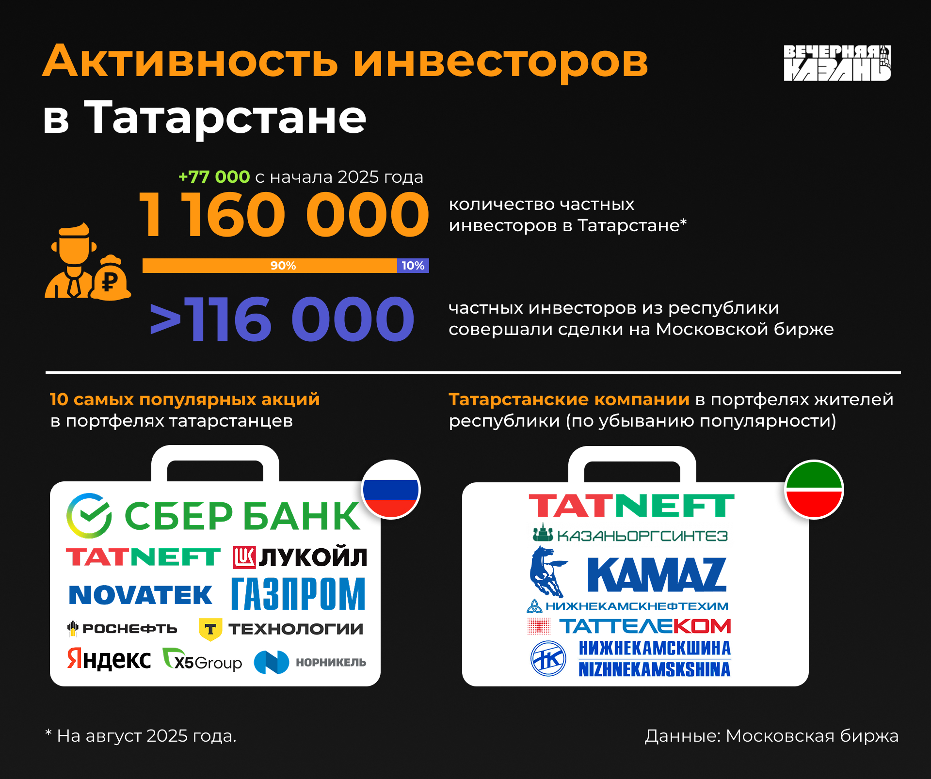 В Татарстане растет активность частных инвесторов: за восемь месяцев 2025 года их стало больше на 77 тысяч, брокерские счета на Московской бирже имеют 1,16 миллиона жителей республики. В августе на торговой площадке совершали сделки более 116 тысяч татарстанцев.