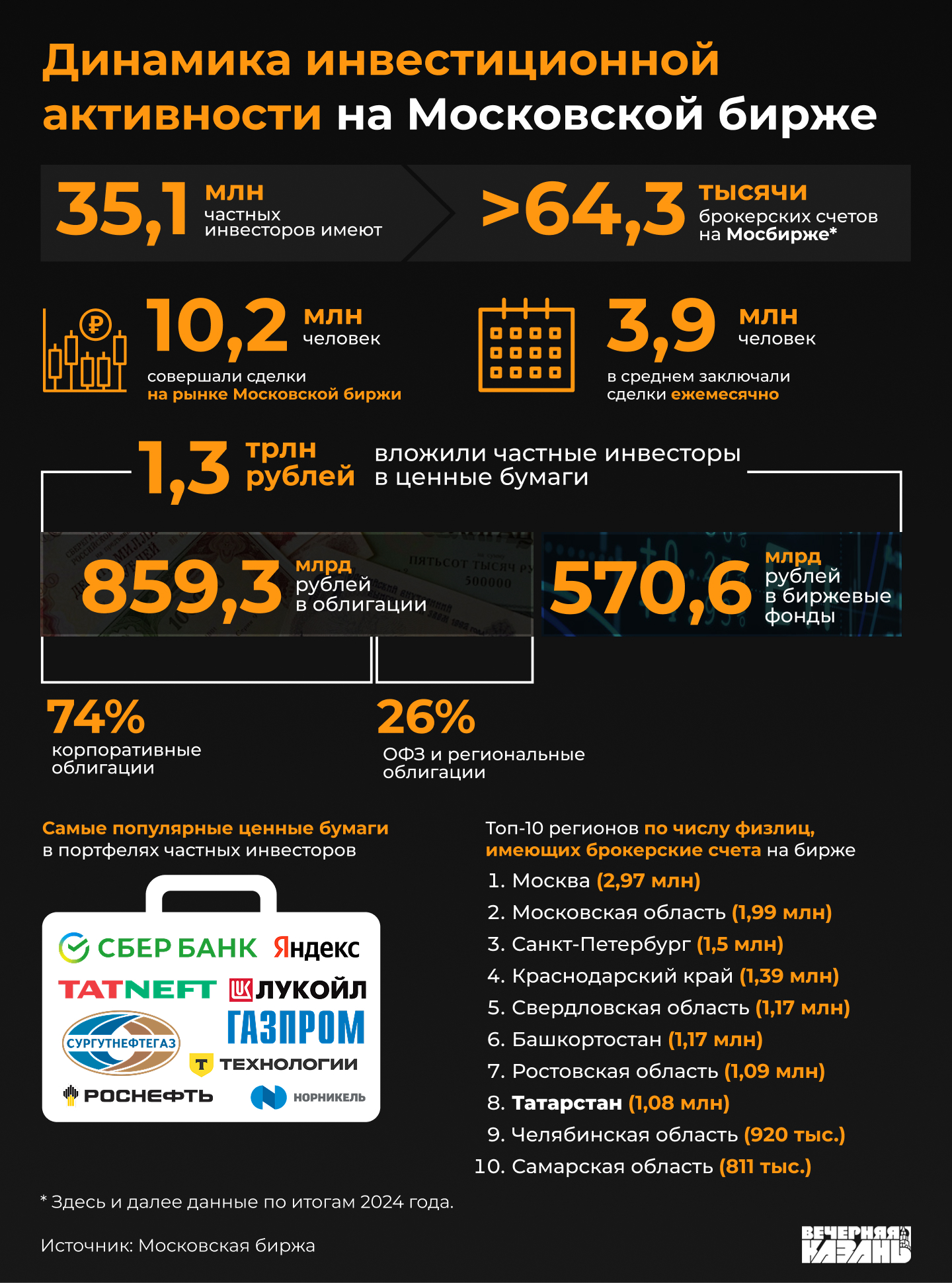 Растущий спрос на инвестиционные инструменты фиксируется по всей стране. За 2024 год количество частных инвесторов, имеющих брокерские счета на Московской бирже, увеличилось на 5,4 миллиона и достигло 35,1 миллиона человек. Они открыли 64,3 миллиона счетов, что на 12 миллионов больше, чем в предыдущем году.
