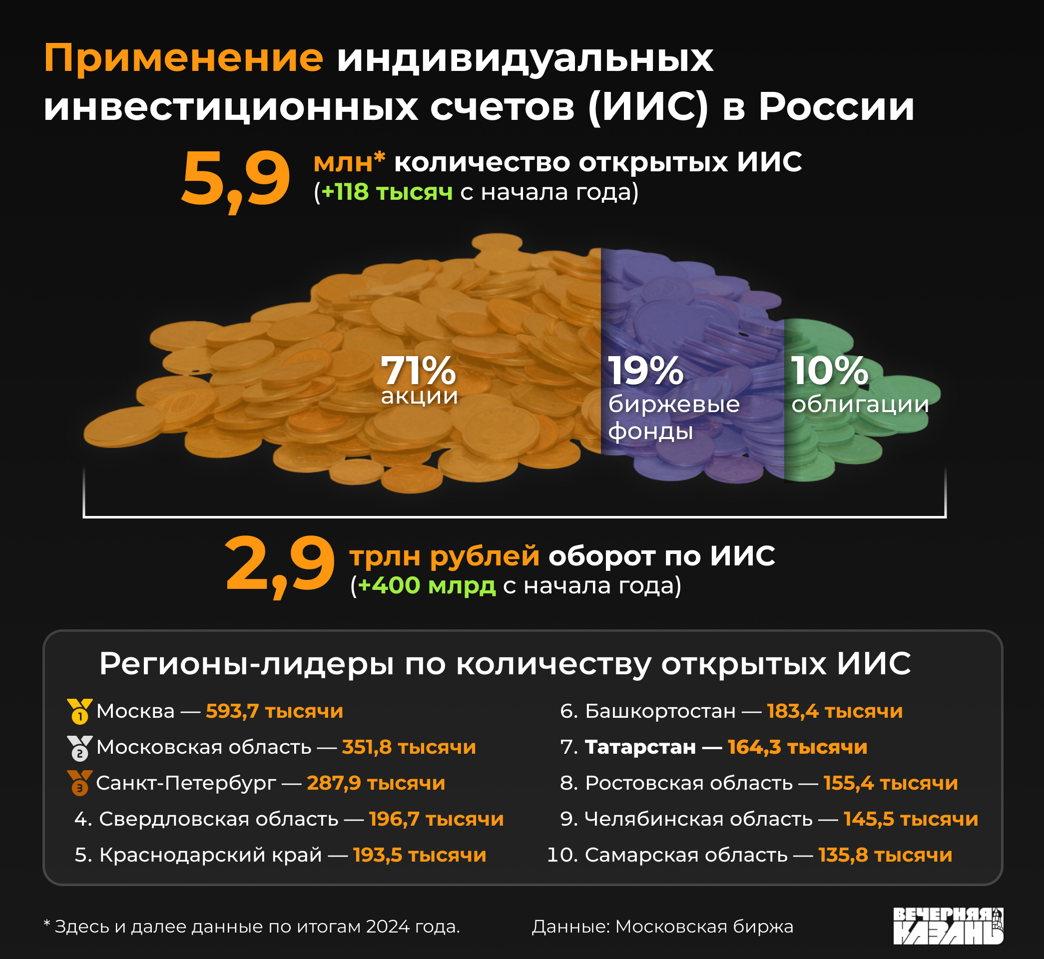 Тенденцию на оживление активности инвесторов подтверждают брокеры и банки, опрошенные «Вечерней Казанью». Например, в Сбербанке количество инвесторов из Татарстана за первую половину 2025 года увеличилось на 40%, до 193 тысяч человек. В структуре сбережений 54% приходится на депозиты, 22% — на брокерские счета. Руководитель брокерского бизнеса Сбера Аиша Кубезова считает это неплохим соотношением, так как это говорит о тенденции к увеличению инвестиционной активности. Она вспомнила, что в 2018 году россияне хранили на депозитах 27 триллионов рублей, а в инвестициях 2 триллиона, то есть соотношение составляло 12:1. Сейчас это соотношение составляет 60 триллионов и 11 триллионов соответственно, то есть соотношение составляет 5:1. По мнению Кубезовой, через 5-6 лет распределение активов между депозитами и инвестиционными инструментами станет более равномерным.