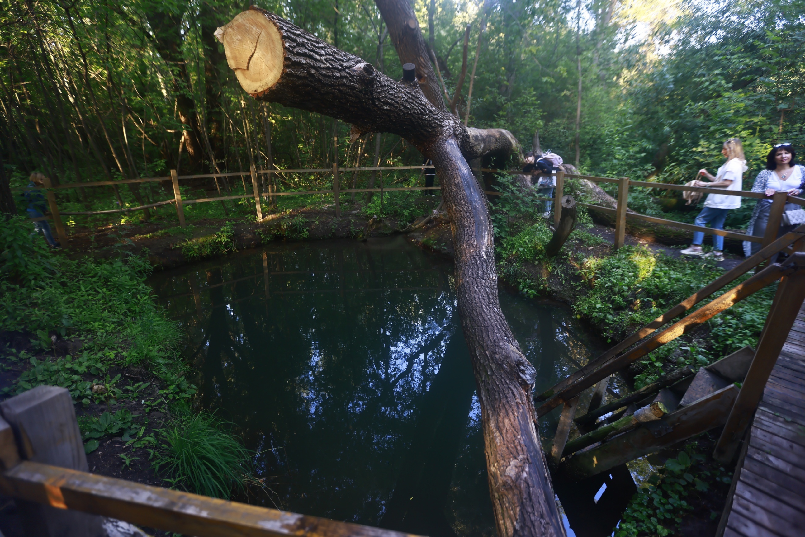 Глубину купели пытались вырыть под 3,5 метра, но дошли пока только до 1,8 метра. Водоем начали делать активисты, когда сюда еще можно было заехать на тракторе. Сейчас этим занимается мэрия, глубину подкапывают, сделали бортики. Даже упавшая поперек купели ива не мешает. Дерево признали неаварийным, с него можно прыгать даже детям.