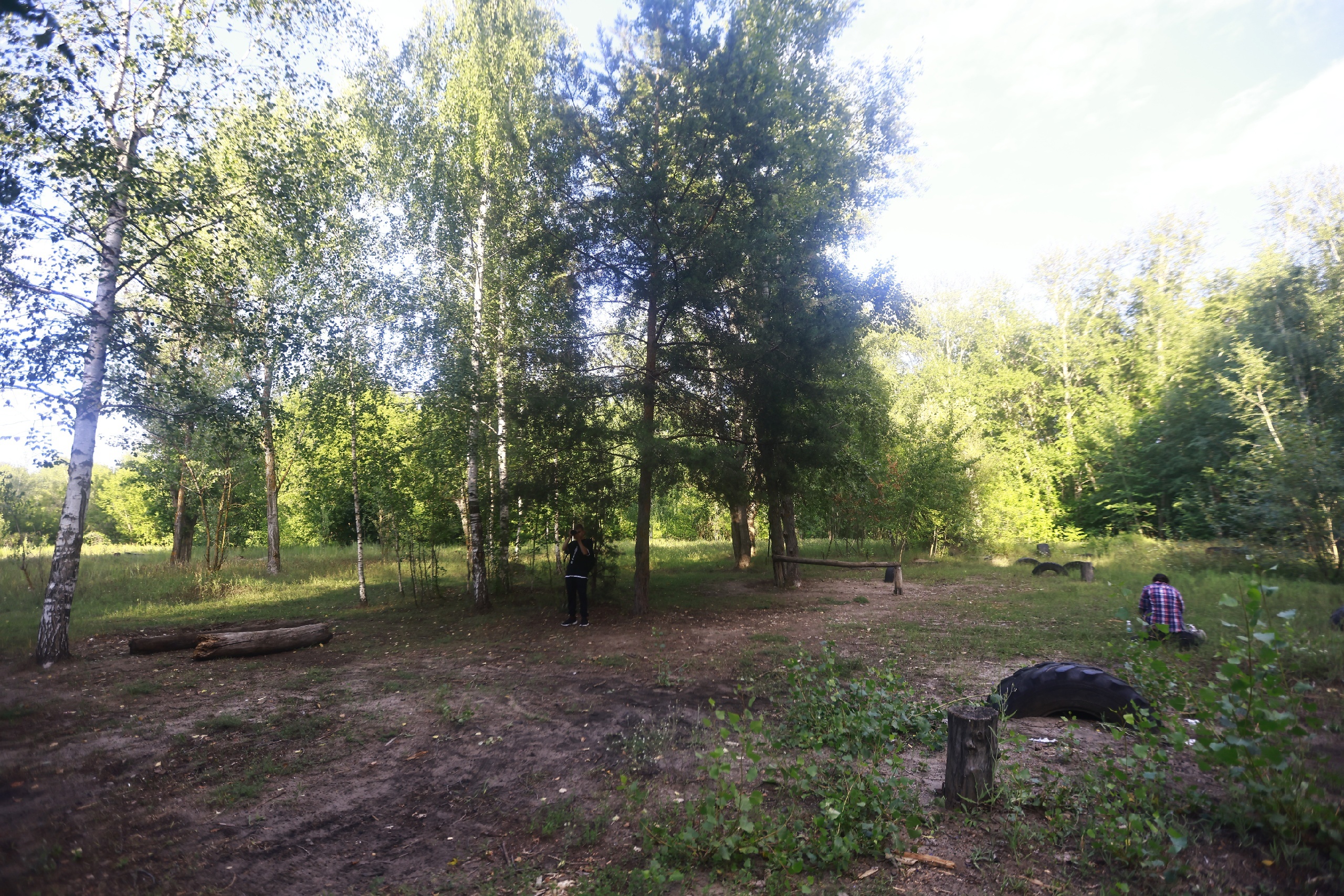 Старая паркурная площадка расположилась среди зарослей. Невнимательный турист не увидел бы в этом месте ничего примечательного. Только вкопанные в землю колёса и пара положенных друг на друга брусьев напоминают о том, что когда-то здесь «кипела» спортивная жизнь.