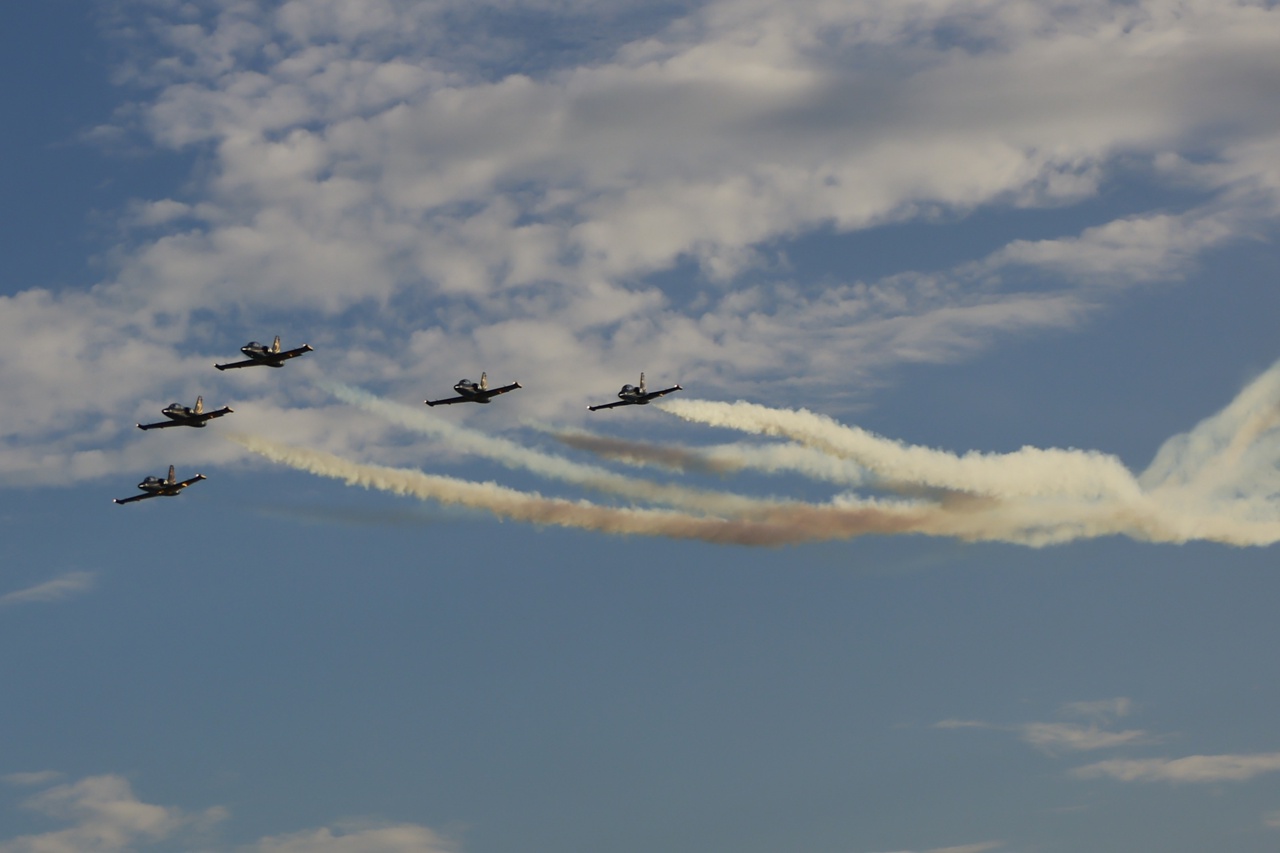 Продолжила череду фигур высшего пилотажа группа «Русь». Асы на пяти тренировочных самолетах Л-39 показали 30-минутный пролет со сложными маневрами вроде косой петли. Фирменными «автографами» в небе рисовали «роспуск тюльпанов», «фонтан» и даже сердце.