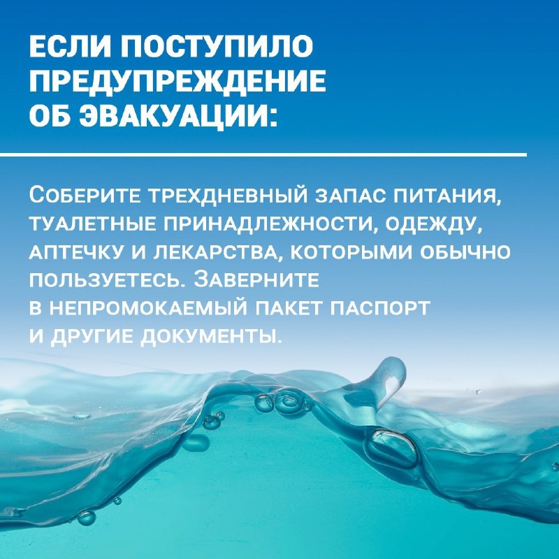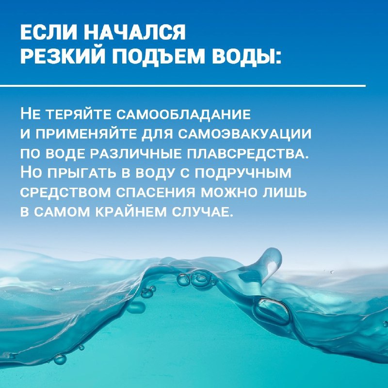 При поступлении предупреждения об эвакуации нужно собрать трехдневный запас питания, лекарства, завернуть в непромокаемый пакет паспорт и другие документы. При резком подъеме воды необходимо быстро забраться на высокое и безопасное место, например, на крышу или дерево. Нужно быть готовым к эвакуации. Для самоэвакуации по воде можно применять различные плавсредства, но прыгать в воду рекомендуется только в крайнем случае.