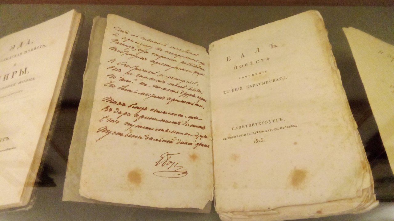 А теперь давайте осмотримся. В первую очередь уделим внимание витрине, где представлены такие прижизненные издания Боратынского, как объединенные под одной обложкой «Эда Финляндская повесть» и «Пиры». Описательная поэма» (Санкт-Петербургъ, 1826), изданные в Москве «Балъ» (1828). «Наложница» (1831), «Стихи Евгения Боратынского» (1835). В каждой книге – авторские развернутые подписи. Уникально! Кстати, для общего развития читателей «Вечерки»: поэтический сборник Евгения Боратынского «Сумерки», вышедший в 1842 году, стал первой книгой стихов на русском языке. Спустя годы литературоведы признают его лучшим сборником в истории русской поэзии.