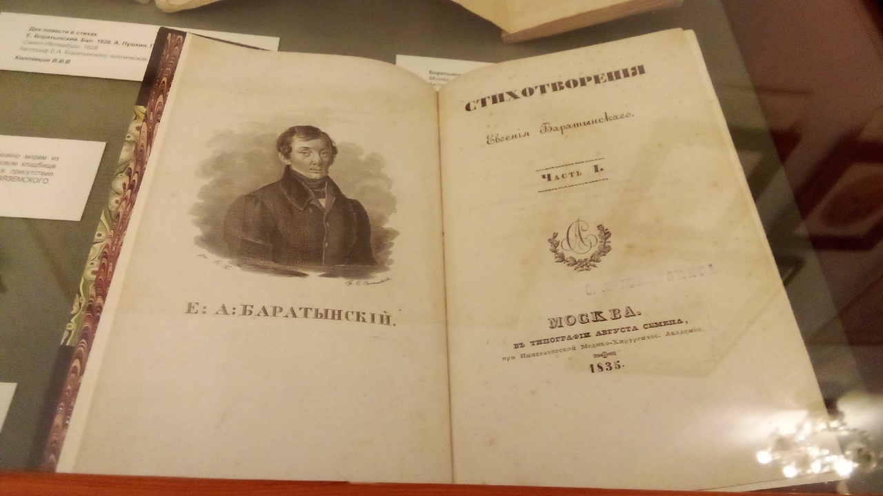 - И это стало возможным благодаря собранию московского коллекционера Владимира Валентиновича Волкова. Для нас, сотрудников Боратынки, это действительно сенсационная экспозиция, настоящее сокровище, – отметила в беседе с редактором отдела культуры «Вечерней Казани» заведующая музеем Е.А. Боратынского (филиала Нацмузея РТ) Ирина Завьялова. – В частности, представлены четыре (!) из шести прижизненных изданий поэта! Собрание коллекционера Владимира Валентиновича Волкова, скончавшегося в 2008 году, бережно хранят его наследники, которые доверили коллекцию казанскому музею Боратынского для экспонирования, за что мы им крайне признательны.