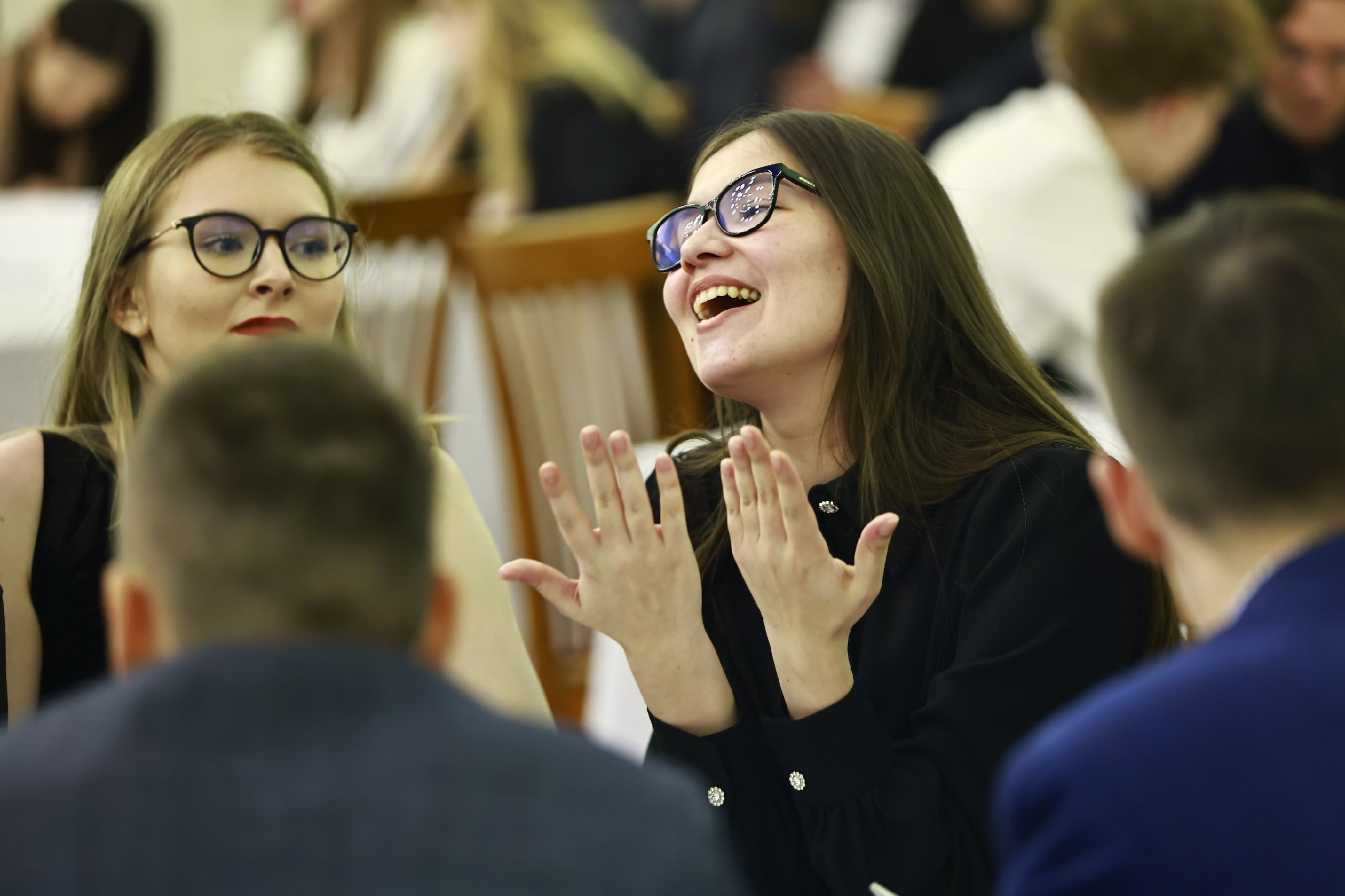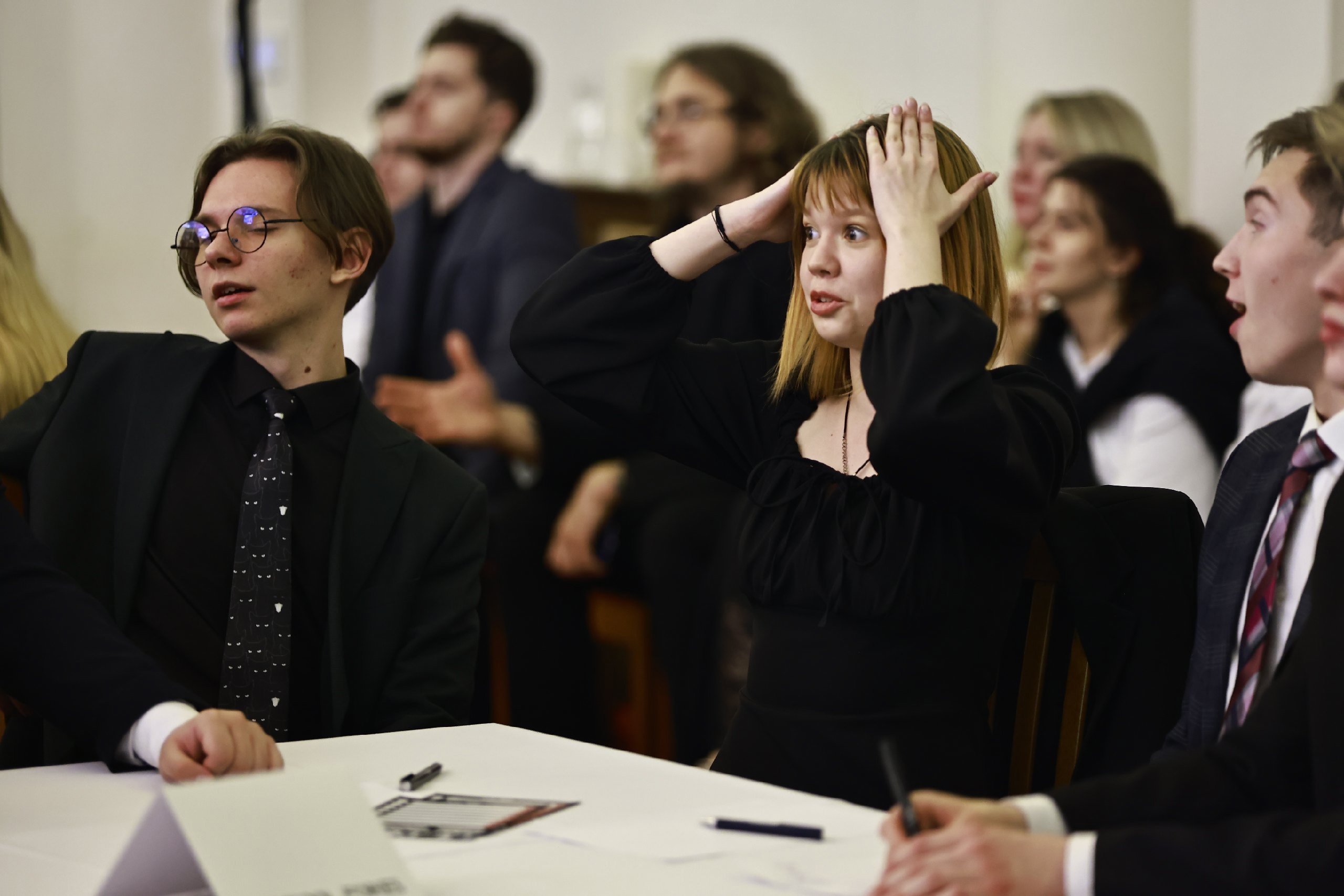 Дресс-код этого вечера — черно-белый, поэтому парни выбрали белоснежные рубашки, а девушки надели элегантные платья. Ребята прибыли задолго до начала мероприятия, чтобы обсудить стратегию на решающую игру. Найти финалистов можно было в фуршет-зоне, где команды говорили о предстоящем турнире и мечтательно рассуждали, как потратят один миллион рублей. И только для одной команды эти мечты в итоге стали реальностью.