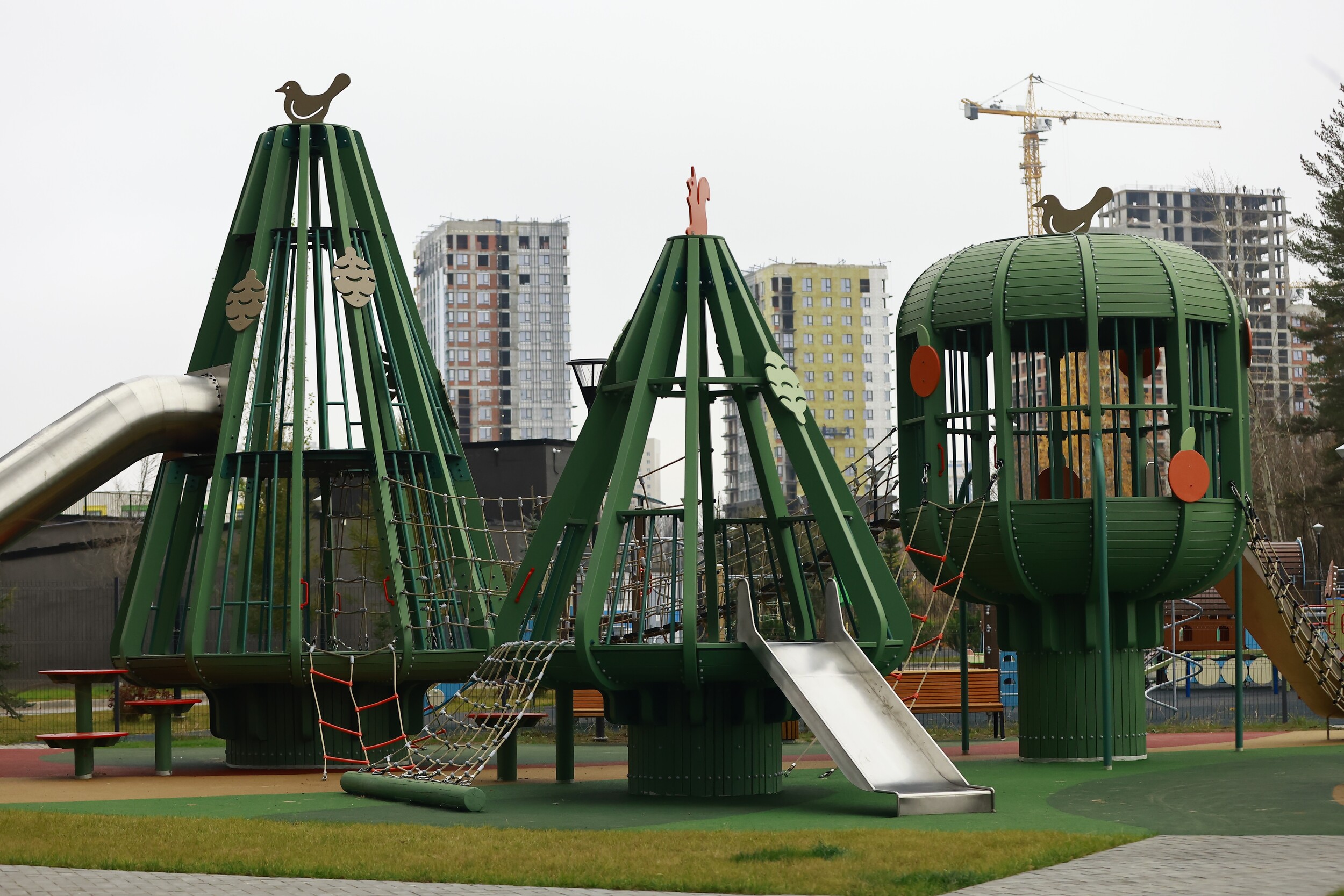 Пространство вокруг дома сделано с учетом пожеланий жителей самых разных возрастов. Детская площадка выполнена в тематике леса - игровые конструкции глубокого зеленого цвета дополняют элементы в виде лесных зверей, шишек и даже сказочных грибов. На скамейках вокруг площадки можно передохнуть и последить за ребенком. Рядом расположена взрослая воркаут-зона. За домом, в уже более спокойной атмосфере, стоят скамейки-беседки. Место идеально подходит для того, чтобы собираться с друзьями или семьей.