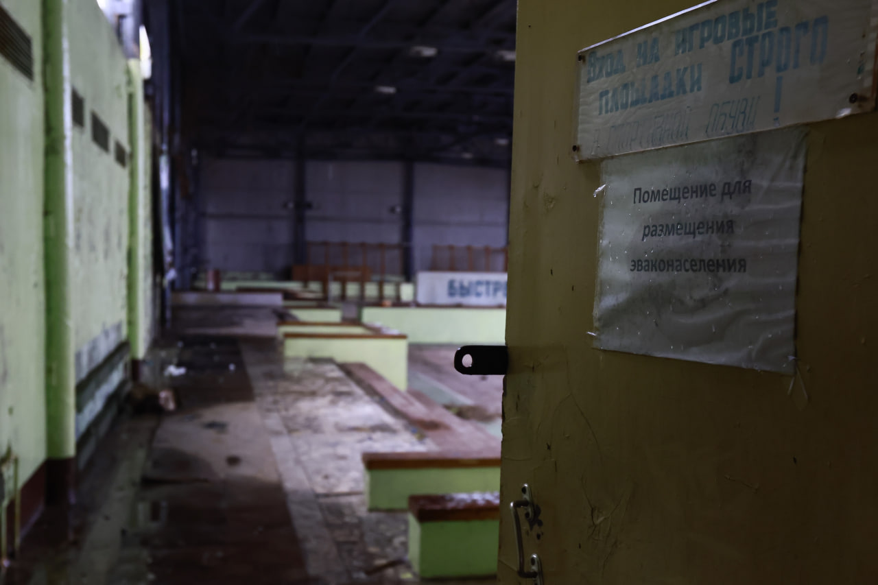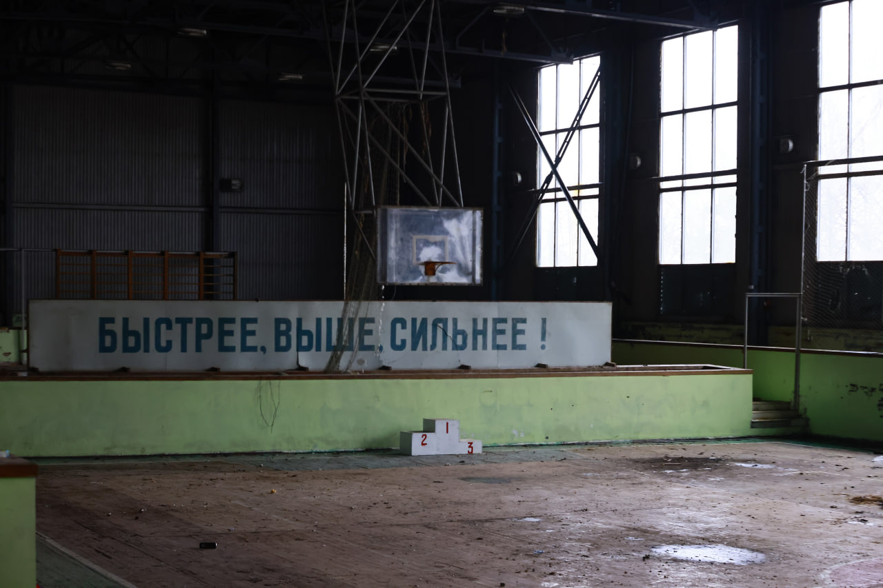 Наверное, самый целый здесь спортивный зал. Несмотря на гнилой пол, все еще висит канат, стоит шведская стенка, баскетбольные кольца, надпись «Быстрее. Выше. Сильнее!».