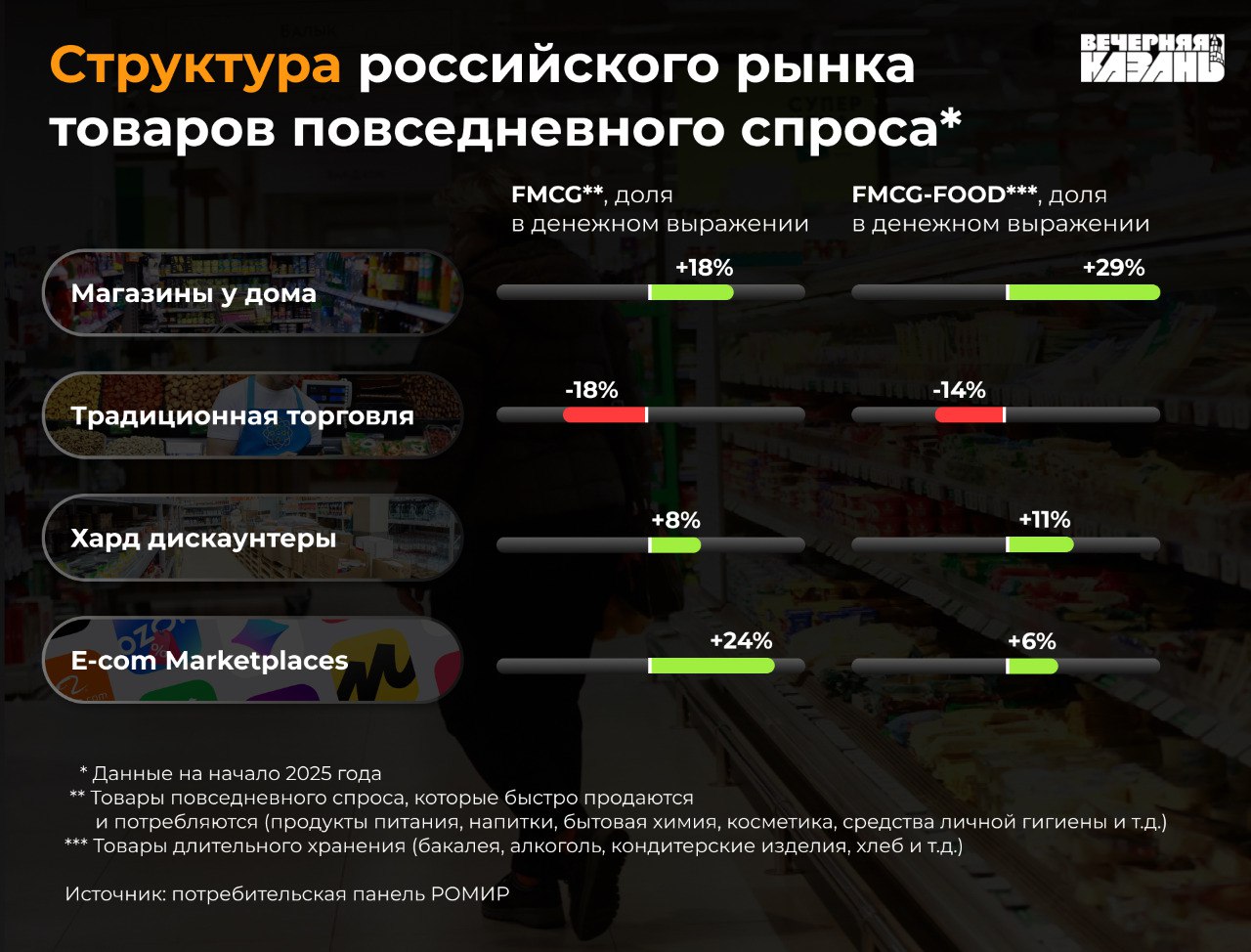 В сегменте FMCG FOOD-ретейла или товаров повседневного спроса длительного хранения (бакалея, алкоголь, кондитерские изделия, хлеб и т. д.) наиболее популярными у покупателей остаются магазины у дома, отмечает соавтор исследования компания РОМИР. В этот формат перетекает аудитория рынков и ярмарок и других традиционных форматов.