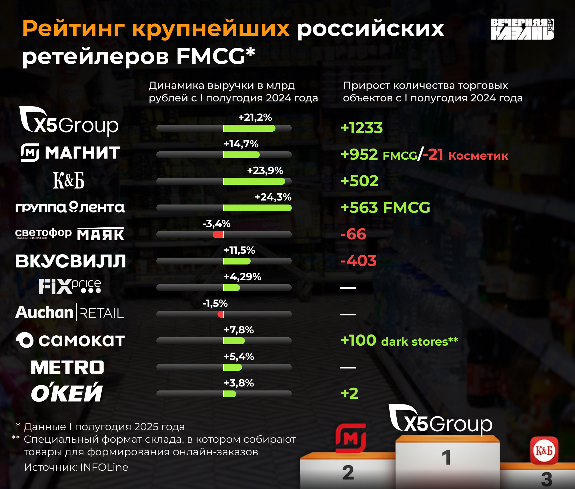 В то же время аналитики INFOLine отмечают пятилетний минимум прироста торговых площадей в ретейле — в первом полугодии этого года он составил 832 тысячи «квадратов» против 990 тысяч за тот же период 2024 года. Лидерами по расширению сети ожидаемо стали X5, «Магнит», «Монетка» и FixPrice.