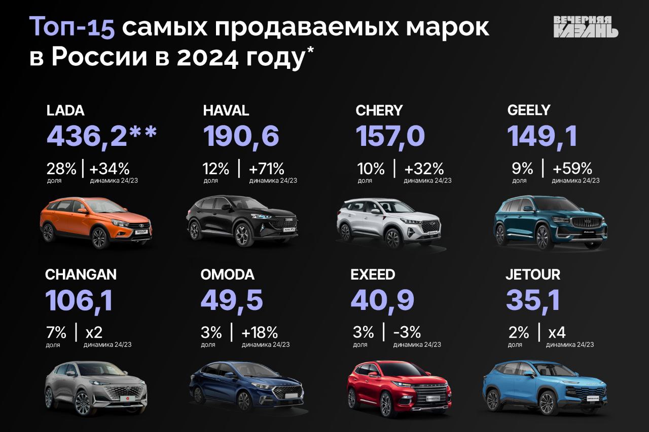 По данным «Автостата», около 28% от общего объема общероссийских продаж приходится на отечественную марку LADA (годом ранее ее доля составляла все 30%). Самым популярным иностранным брендом по итогам минувшего года (как, впрочем, и в 2023 году) стал Haval.