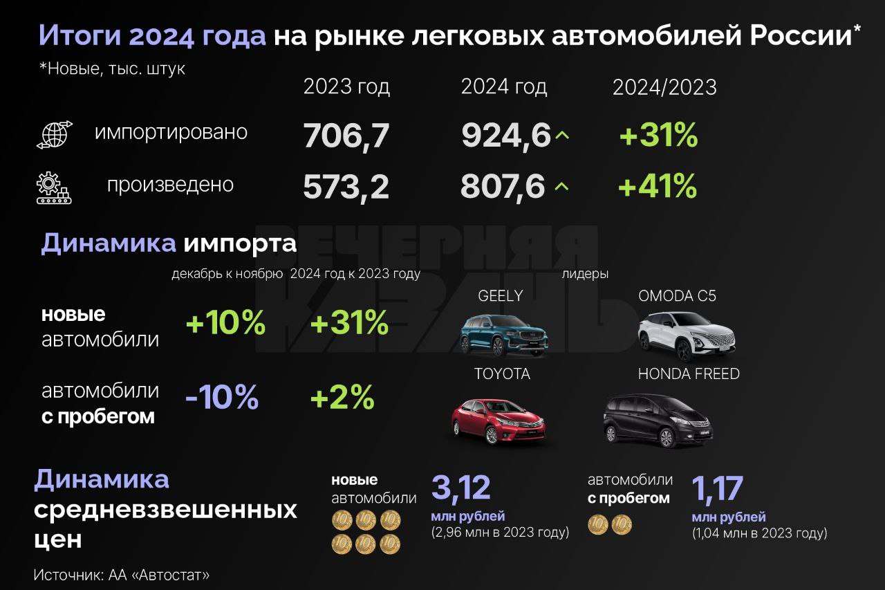У аналитического агентства «Автостат» эти показатели чуть выше: продажи прошлого года там оценили в 1,6 миллиона штук, что на 48,4% больше, чем в 2023 году.