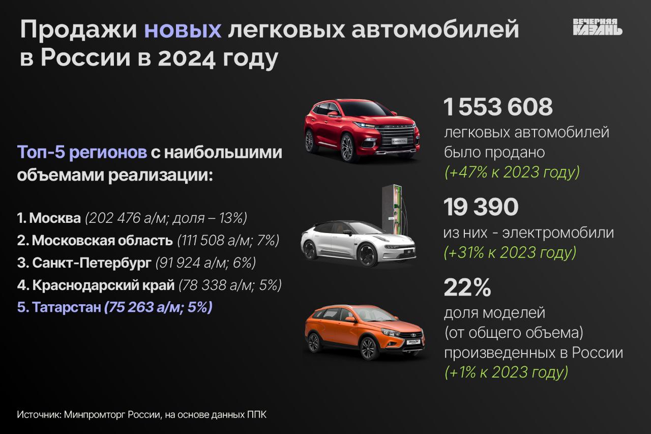 Татарстан по итогам 2024 года вошел в число российских регионов с наибольшим количеством проданных легковых автомобилей.