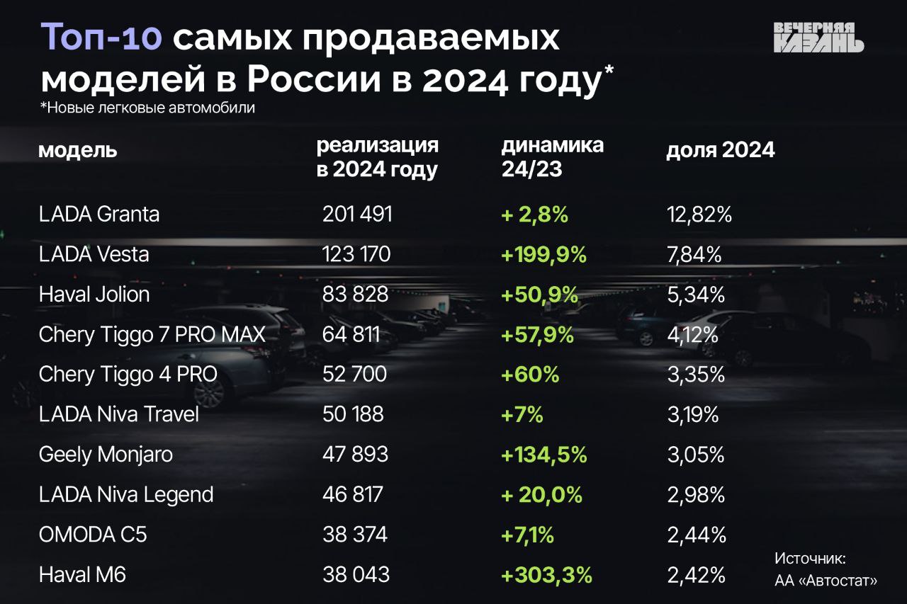 Лидерство в модельном рейтинге третий год подряд принадлежит автомобилям семейства LADA Granta (в том числе произведенным на его базе). Второе место у LADA Vesta, за год удвоившей долю. Лучшей иномаркой в России остался кроссовер HAVAL Jolion. В топ-10 попали еще две отечественные и пять китайских моделей. При этом все они показали прирост продаж.