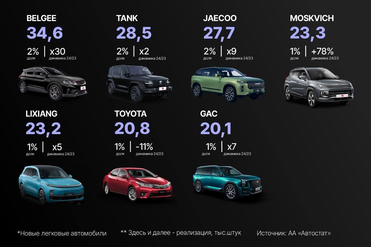 Следующие шесть позиций в марочном рейтинге тоже занимают «китайцы». В первую десятку попали и белорусский Belgee, и китайский TANK. Только EXEED по итогам 2024 года показала отрицательный результат. Рост же скромнее всего у OMODA (+18%), а наиболее значимо продажи выросли у Belgee (почти в 30 раз).