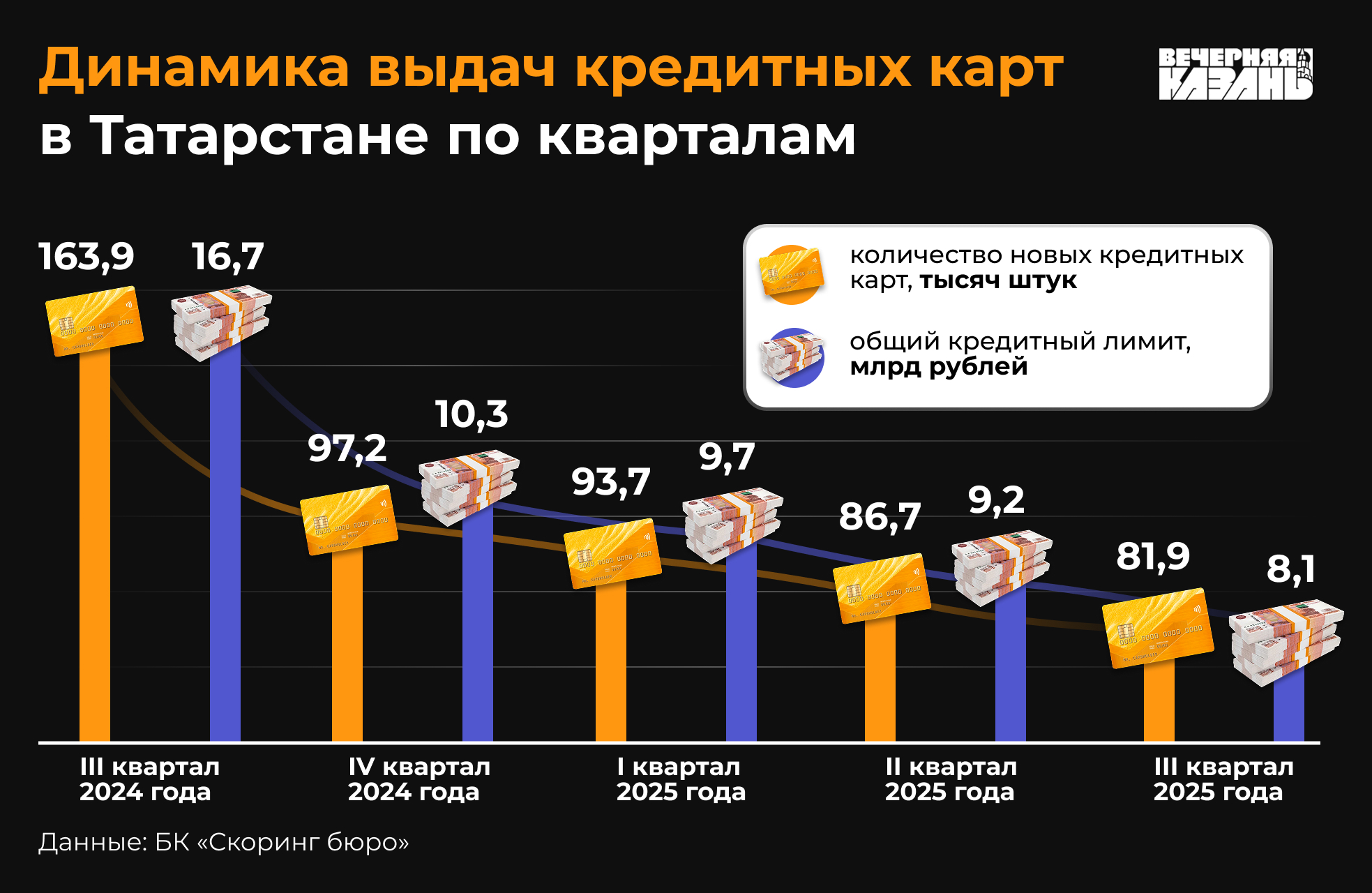 Снижение выдач особенно заметно по квартальной динамике, предоставленной «Вечерней Казани» организацией «Скоринг Бюро». В третьем квартале 2025 года в республике выдали 82 тысячи новых новых кредитных карт на общую сумму установленных кредитных лимитов 8,1 миллиарда рублей. По сравнению со вторым кварталом сумма выдач снизилась на 12%, а в штуках — на 5,5%. Сравнивая третий квартал текущего года с аналогичным периодом предыдущего, можно сделать вывод: объем выданных карт и установленных по ним лимитов снизился в два раза. Годом ранее за третий квартал банки выдали татарстанцам 164 тысячи кредитных карт на 16,7 миллиарда рублей.