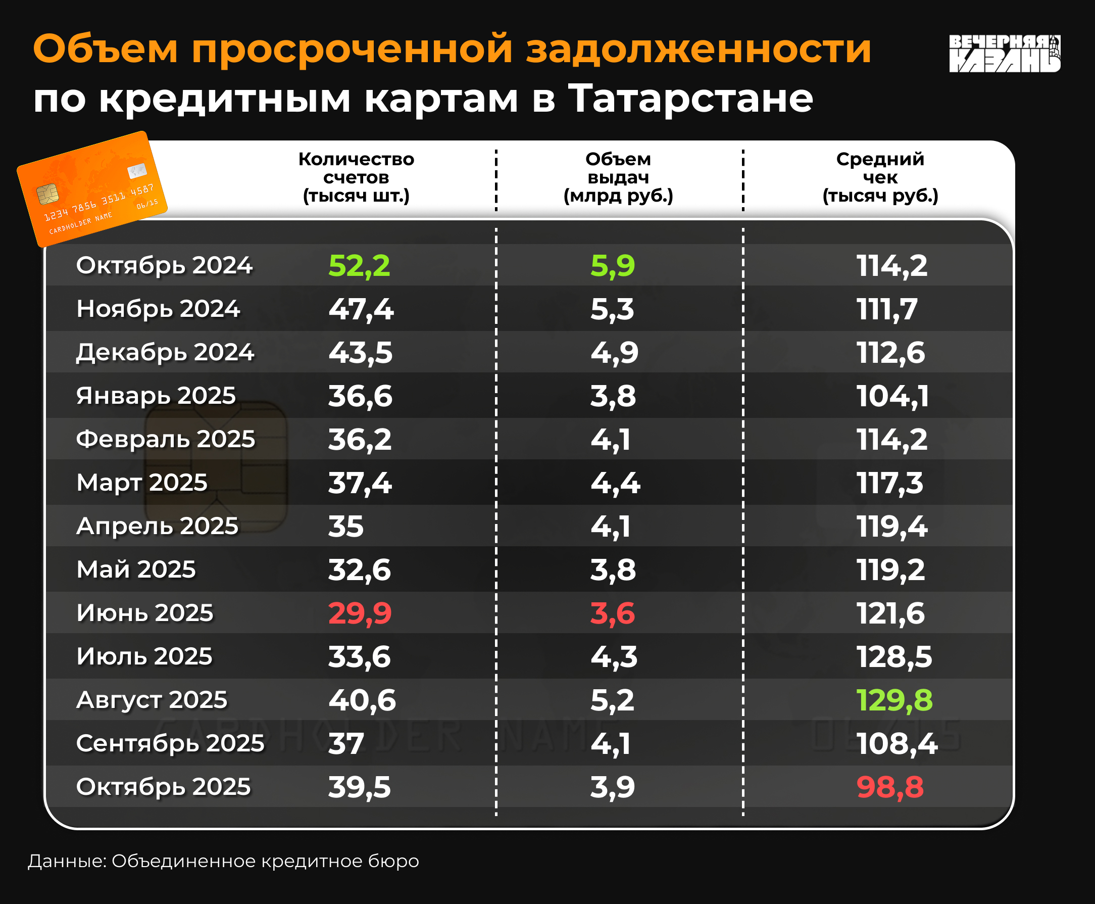Тенденция к охлаждению рынка кредитования действительно прослеживается: объем выдач по кредитным картам в Татарстане снижался в течение всего 2025 года. По данным ОКБ, пиковым месяцем стал август: тогда банки выдали жителям Татарстана 5,2 миллиарда рублей по кредитным картам. В сентябре-октябре количество выданных кредиток и средний чек по ним снова начал снижаться.