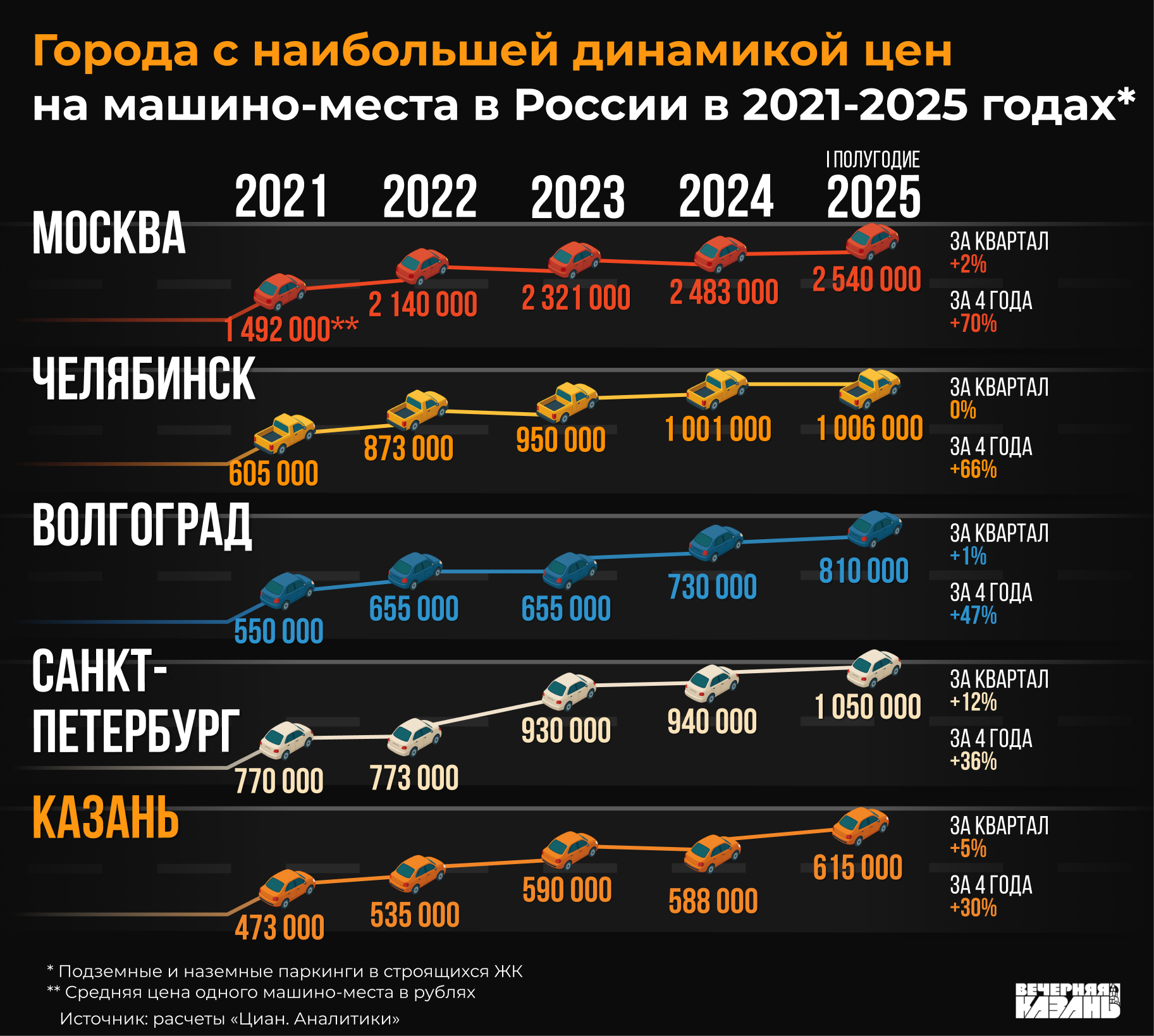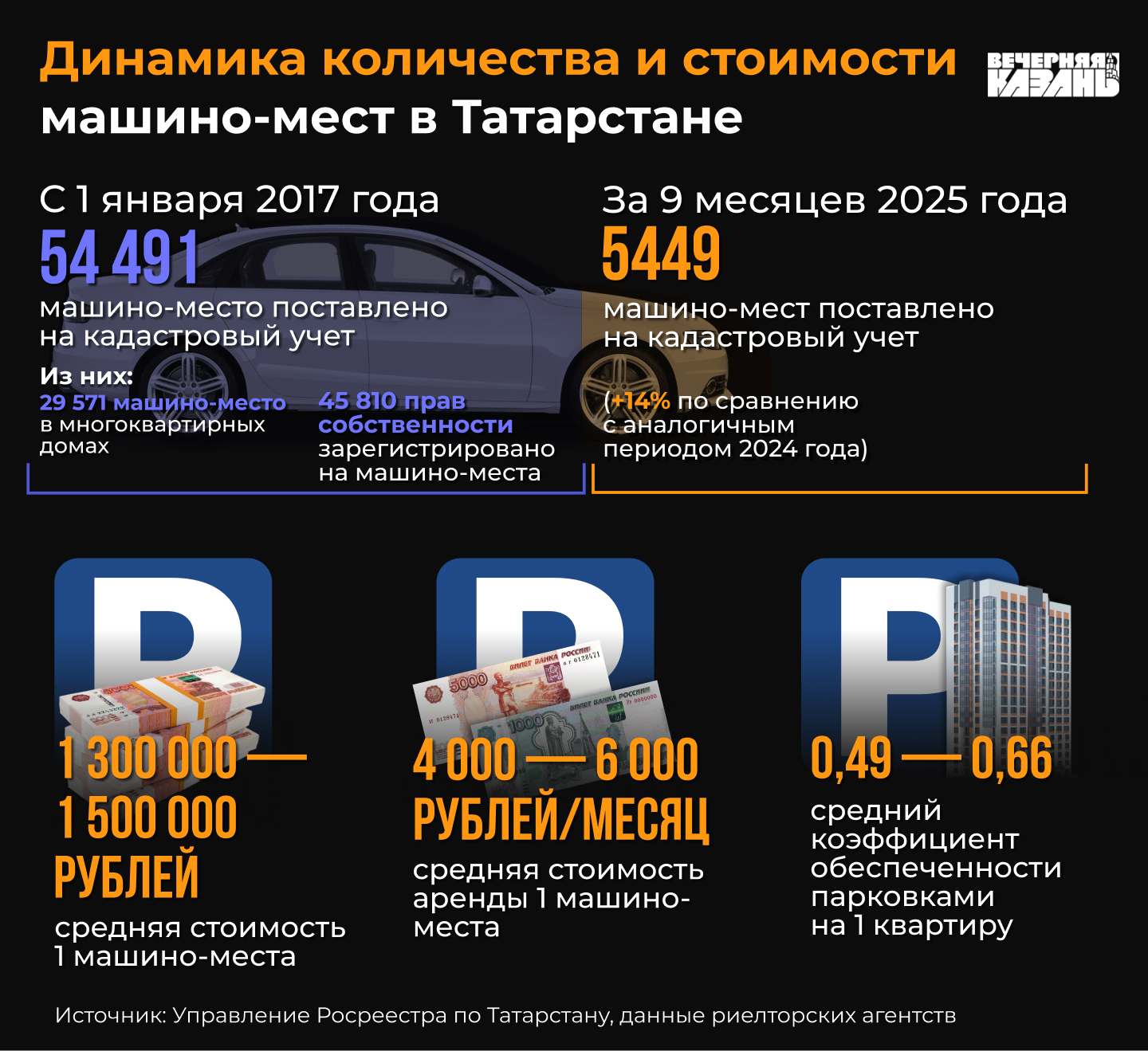 — В миллион рублей может оцениваться машино-место в ЖК экономкласса на окраинах Казани, а если это какой-то элитный жилой комплекс бизнес-класса, как, например, «Панорама», стоимость парковки там может доходить и до 5 миллионов рублей, — проиллюстрировал он свой ответ.