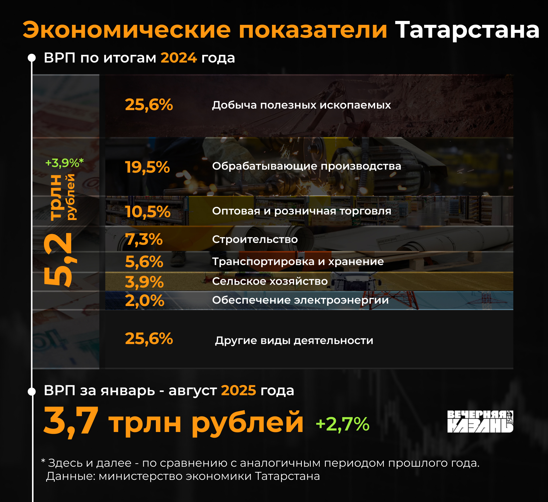 Валовый региональный продукт (ВРП) Татарстана в 2024 году вырос значительнее прогнозируемого уровня и превысил 5 триллионов рублей. Однако химическая промышленность столкнулась с трудностями: объем производства снизился, и виной тому санкции, ограничившие экспорт, а особенно повлиявшие на поставки каучука в Европу, которые ранее составляли около 30% от общего объема. Хотя по итогам 2024 года химическая промышленность показала рост на 5,3% к уровню 2023 года, давление на сектор не ослабло и осталось важным фактором, определяющим динамику.
