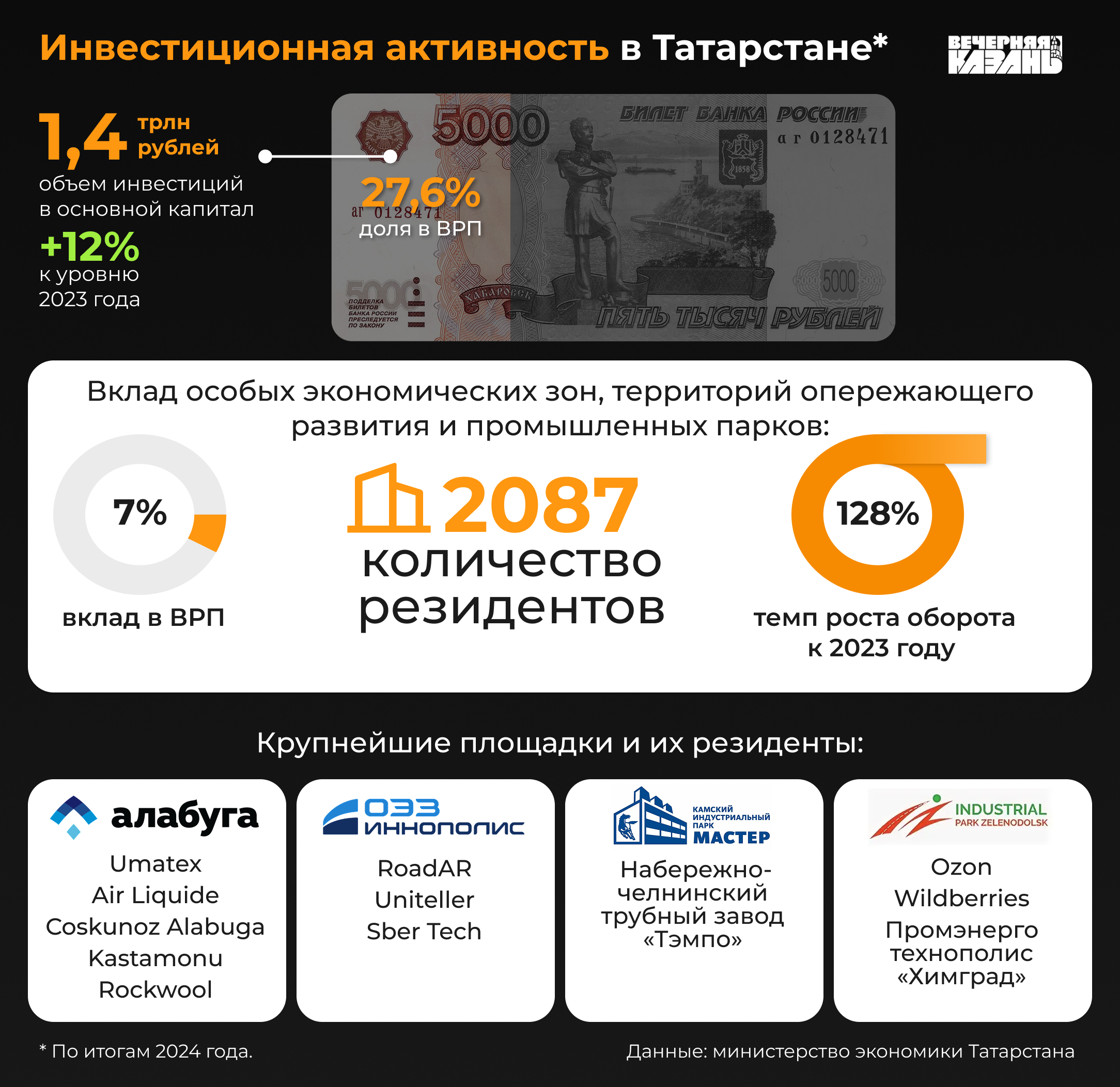 Директор по стратегии ИК «Финам», преподаватель НИУ ВШЭ Ярослав Кабаков заметил, что в последние годы особое внимание в Татарстане уделяется диверсификации экономики за счет поддержки малого и среднего бизнеса, развития ОЭЗ и индустриальных парков, где растет объем выпускаемой продукции и услуг, а также цифровизации ключевых отраслей.