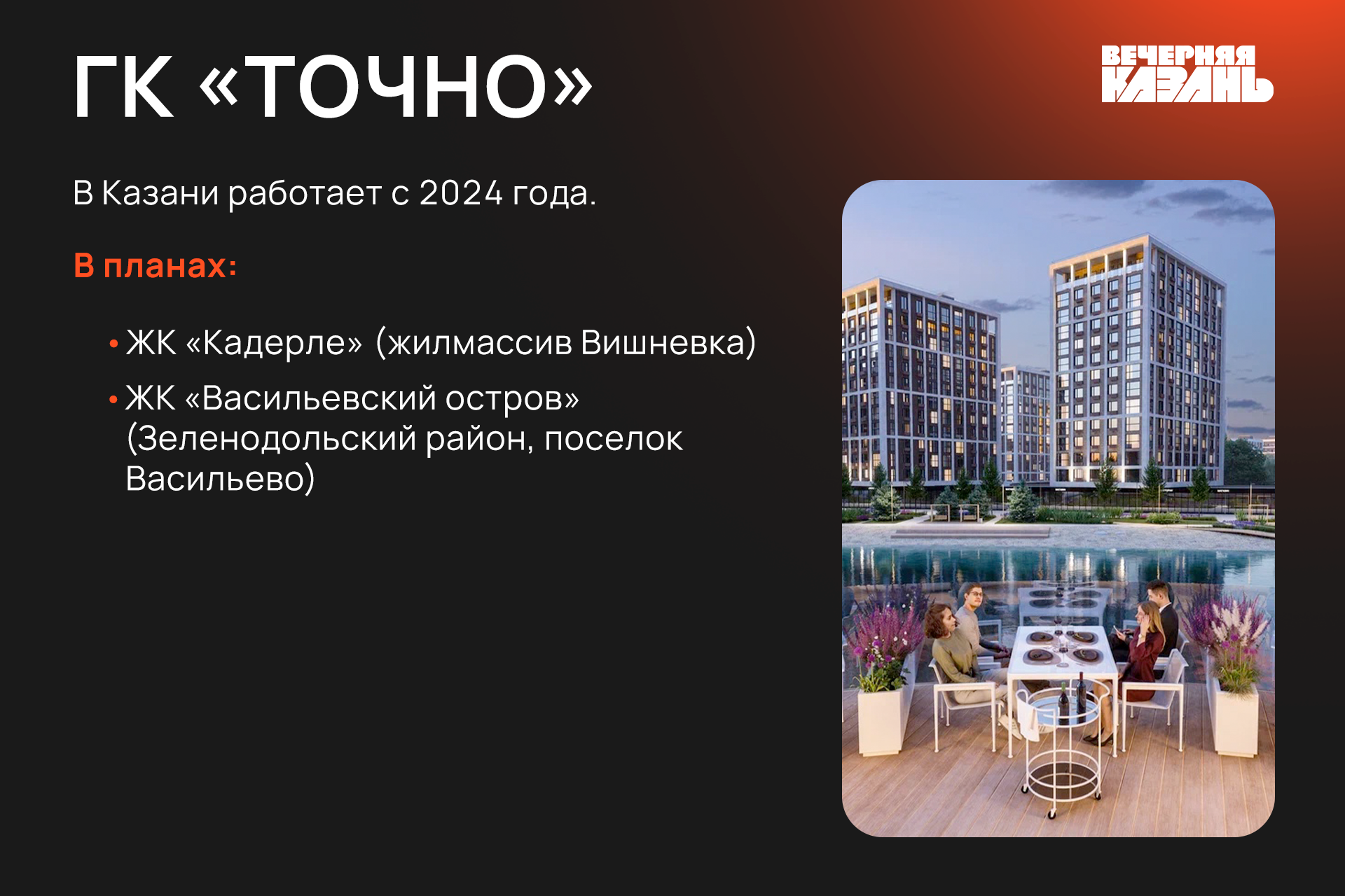 Совсем недавно на рынок зашла и краснодарская ГК «ТОЧНО». В январе 2025 года владелец бизнеса Николай Амосов презентовал проекты компании раису Татарстана Рустаму Минниханову. В республике краснодарский девелопер думает начать с двух проектов, в целом по стране компания специализируется на строительстве жилья бизнес- и премиум-класса. У поселка Васильево в Зеленодольском районе появится жилой комплекс «Васильевский остров» на 10 тысяч жителей. В рамках проекта возведут 65 домов высотой от 6 до 14 этажей. Кроме социальной инфраструктуры, школ, детских садов и поликлиники предусмотрена и зона отдыха: пляж у озера, спортплощадки, каток, пять лыжных маршрутов и зоны проката.
