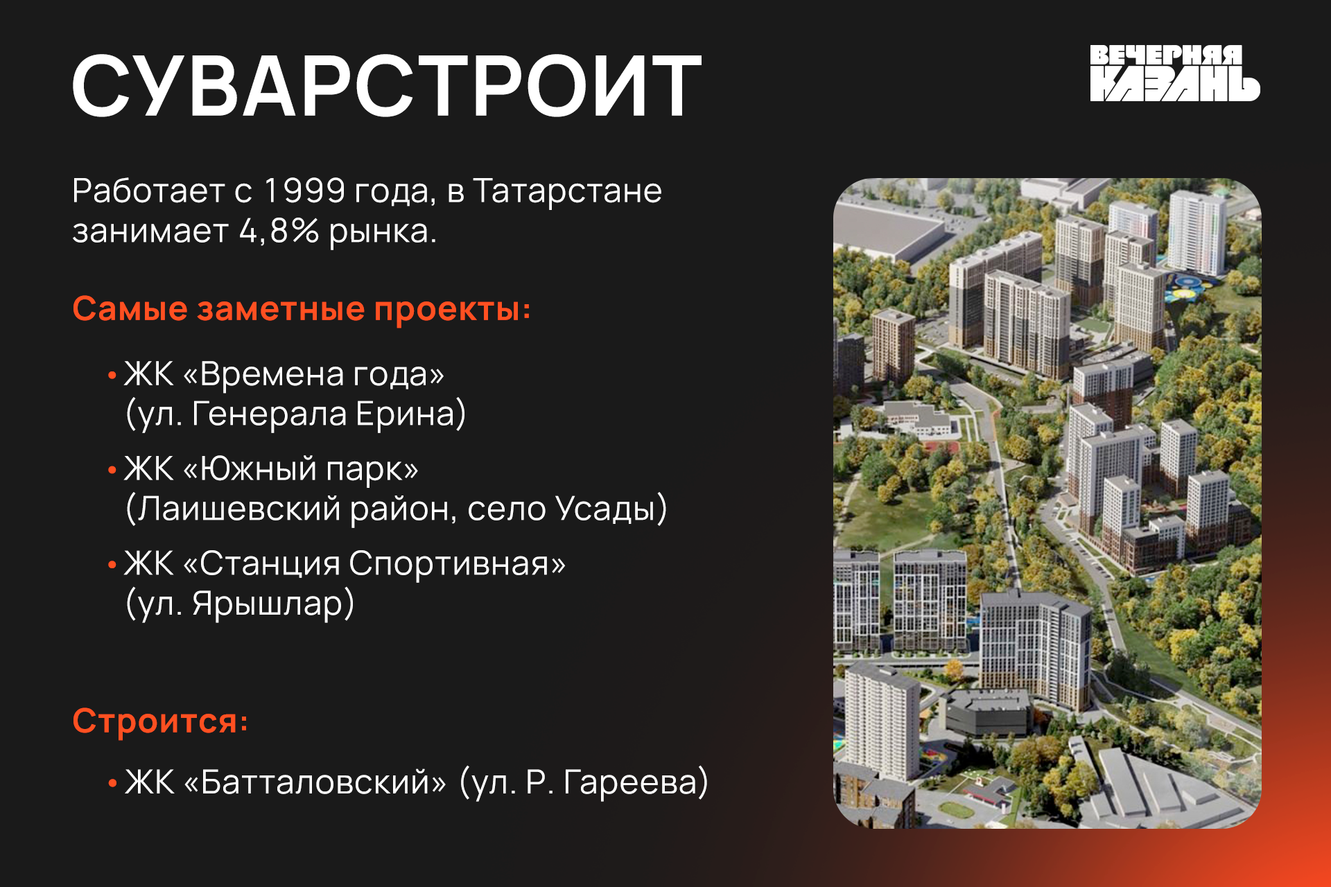 Долгое время работает на строительном рынке и девелопер #Суварстроит, отметив в прошлом году 25-летие. По данным Единого ресурса застройщиков, в 2024 году девелопер ввел в эксплуатацию больше 33 тысяч квадратных метров жилья. В самой компании отметили, что, несмотря на трудные условия в 2024 году, им удалось завершить вторую очередь ЖК «Времена года». Еще один значимый проект девелопера — ЖК «Батталовский» в Приволжском районе Казани, рядом с Оренбургским трактом. В первой части данного ЖК запроектирован фонтан, который станет знаковым местом для семейного отдыха жителей. Комплекс должен стать новой точкой притяжения в этом районе.