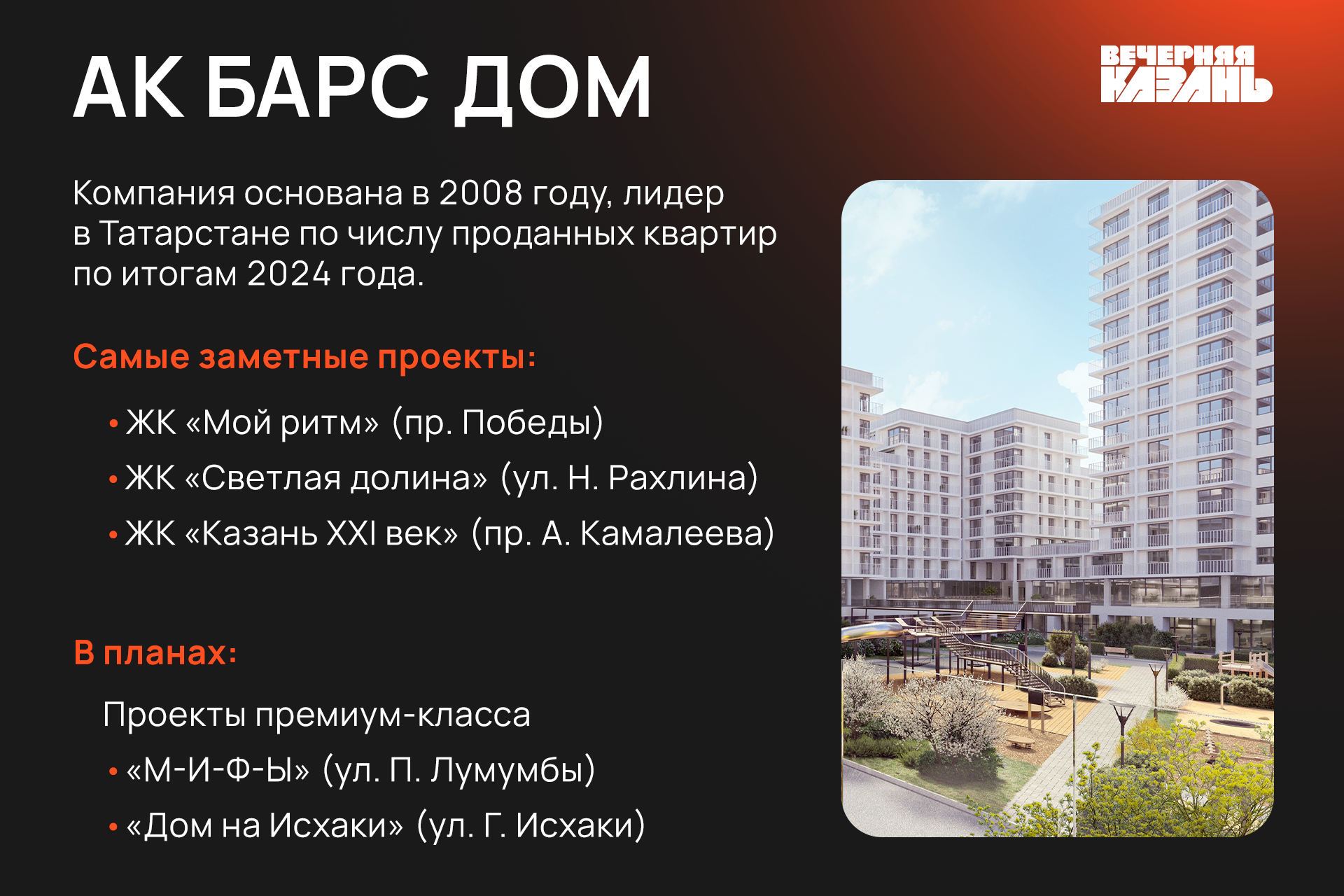 Девелопер «Ак Барс Дом» каждый год входит в топы ведущих игроков рынка недвижимости Татарстана. По итогам 2024 года компания продала больше двух тысяч квартир, став лидером по этому показателю в республике. Большие планы у девелопера и на этот год: уже презентованы два новых проекта премиум-класса — резиденция на Патриса Лумумбы «М-И-Ф-Ы» и «Дом на Исхаки» в исторической части города, рядом с кремлем. К середине года будут выводиться новые объекты в жилых комплексах «Мой ритм», «Дома у сада» и «Новый свет».