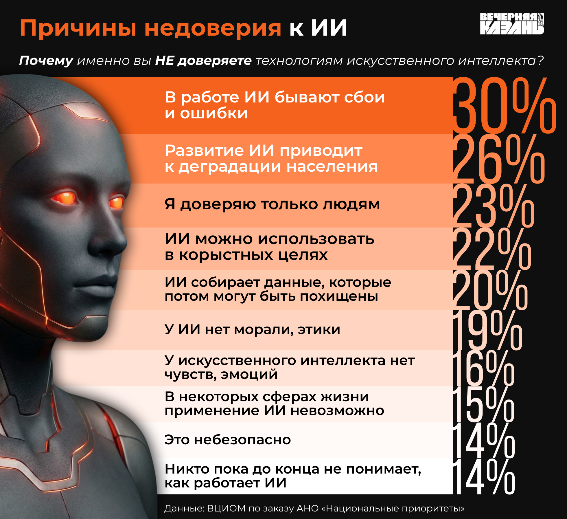 К 2025 году доли тех, кто доверяет искусственному интеллекту и тех, кто сомневается в нем, приблизительно сравнялись. Около 45% положительно относятся к ИИ, примерно 43% смотрят на него с недоверием. Оставшиеся 2% пока не определились, как им относиться к этим технологиям. Чаще всего причинами недоверия к ИИ назывались сбои и ошибки в его работе, провоцирование деградации населения и скепсис.