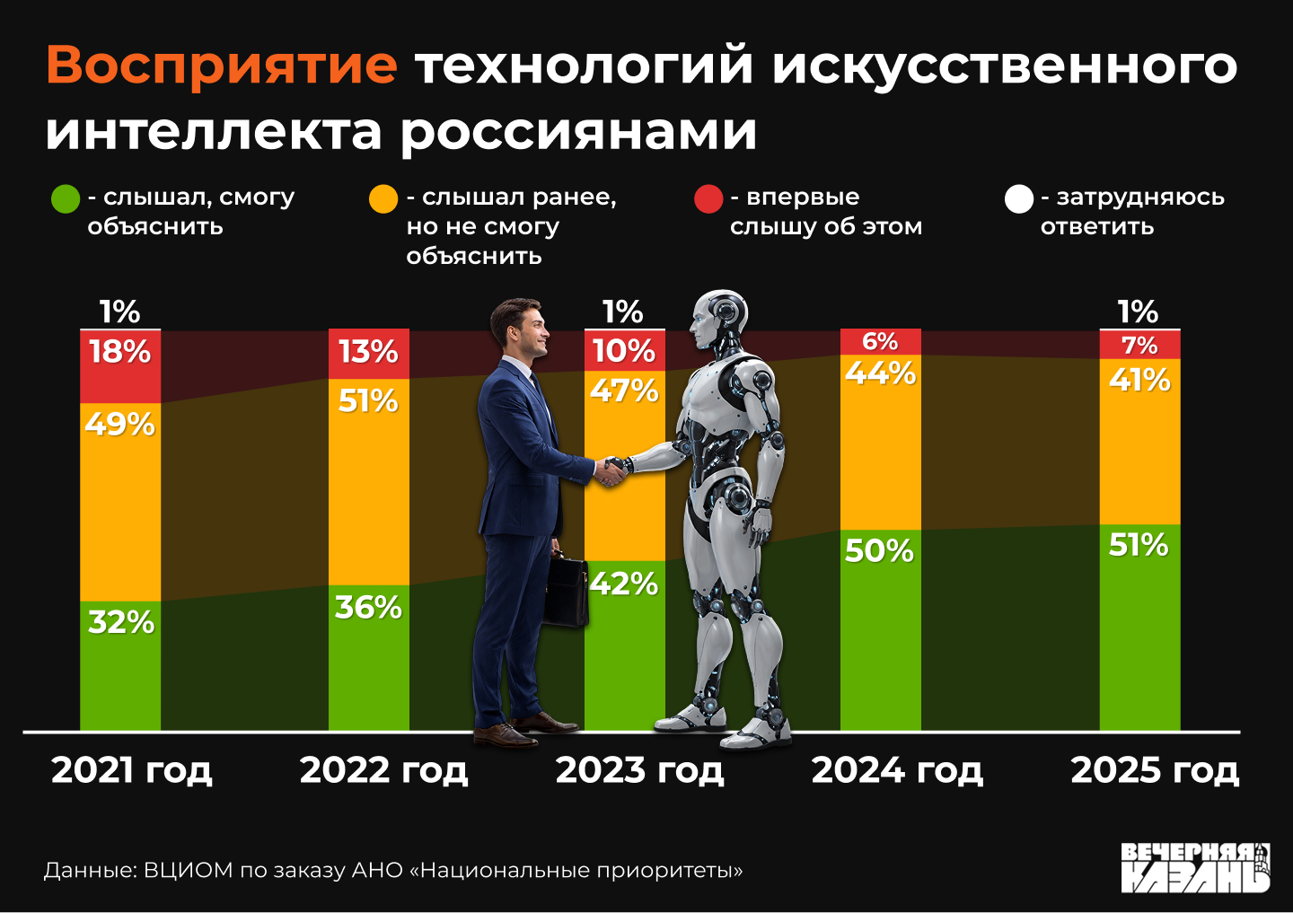 Все больше людей узнает о технологиях искусственного интеллекта и начинает использовать их в своей жизни. Многие знают или слышали о них, но только половина из них может объяснить, что это такое. Такую тенденцию выявил опрос, проведенный ВЦИОМ по заказу АНО «Национальные приоритеты». Осведомленность россиян растет год от года: в 2019 году о них знали 75% опрошенных, а в 2025 году — уже 92%.