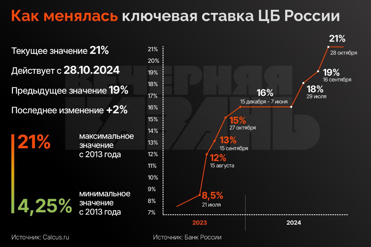 Ключевая ставка выросла на 500 базисных пунктов — с 16% до 21% — во второй половине 2024 года. Тем самым, замечает начальник отдела анализа банков и денежного рынка ИК «ВЕЛЕС Капитал» Юрий Кравченко, она превысила максимум 2022 года в 20%, на котором не задержалась надолго.