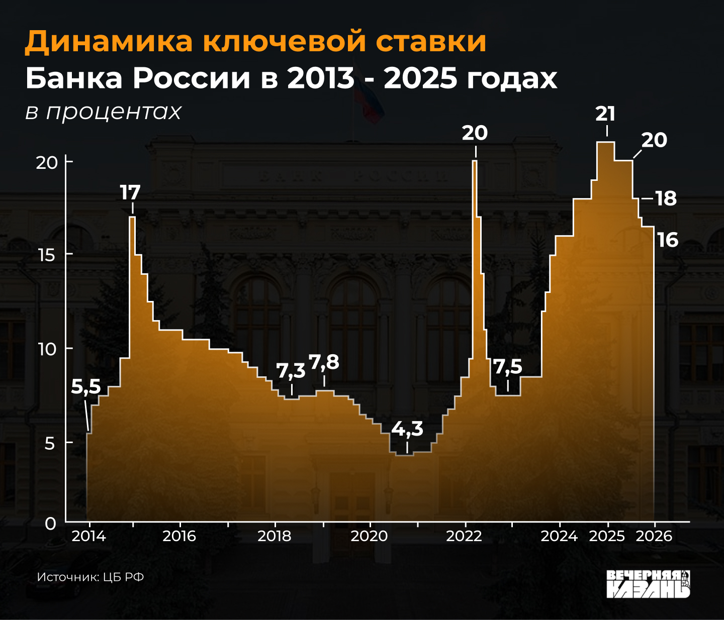 На последнем в 2025 году заседании Банк России в пятый раз подряд снизил ключевую ставку — вновь на 50 базисных пункта: до 16%. То есть всего на полпроцента.