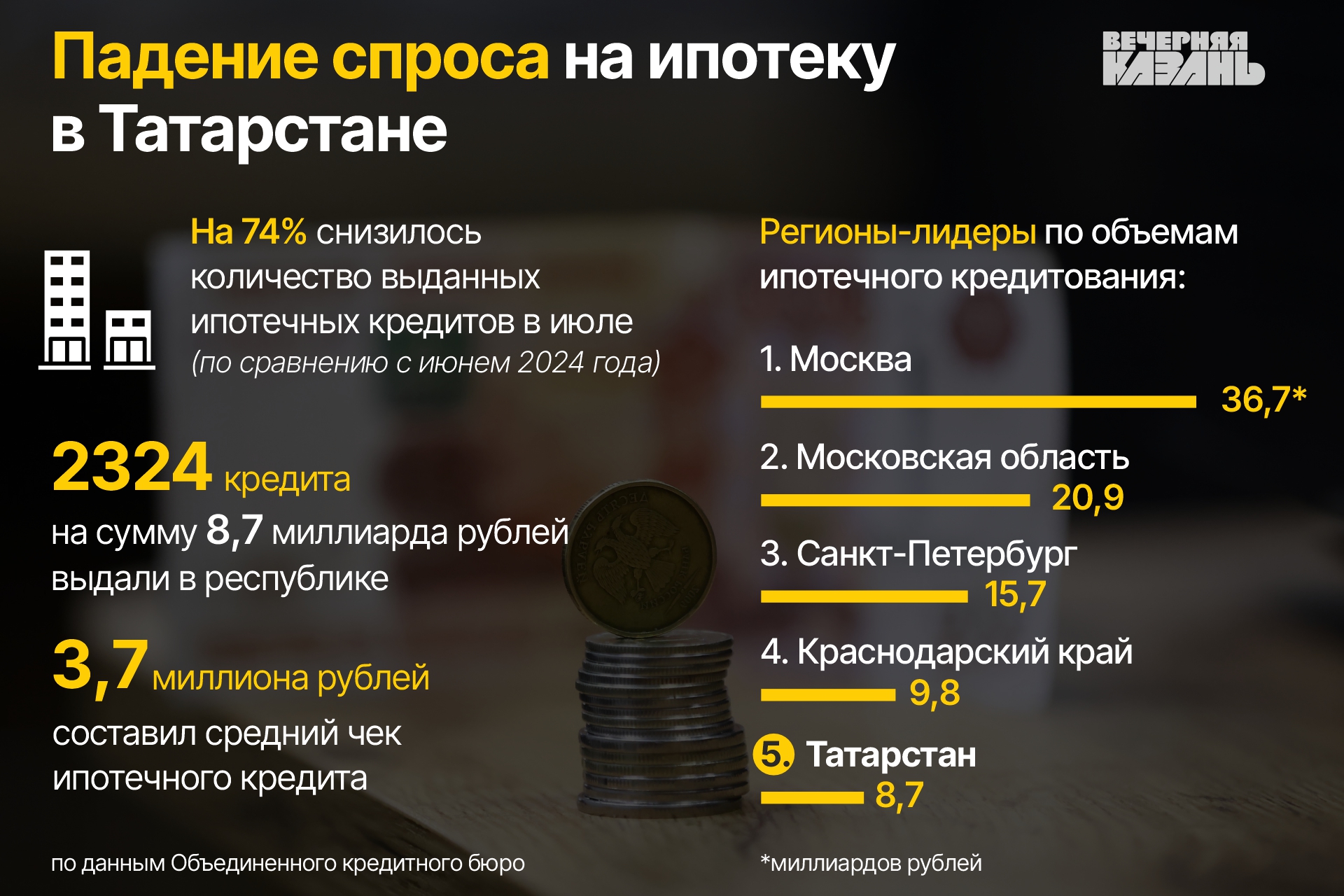 В июле в Татарстане выдали 2,3 тысячи ипотечных кредитов, что на 74% меньше, чем в июне, когда выдали 6,5 тысячи кредитов. Такими данными поделились в Объединенном Кредитном Бюро (ОКБ). При этом республика входит в пятерку лидеров по объему кредитования. Опережают Татарстан Москва, Московская область, Санкт-Петербург и Краснодарский край. В целом по России количество выдач ипотеки сократилось на 55%.