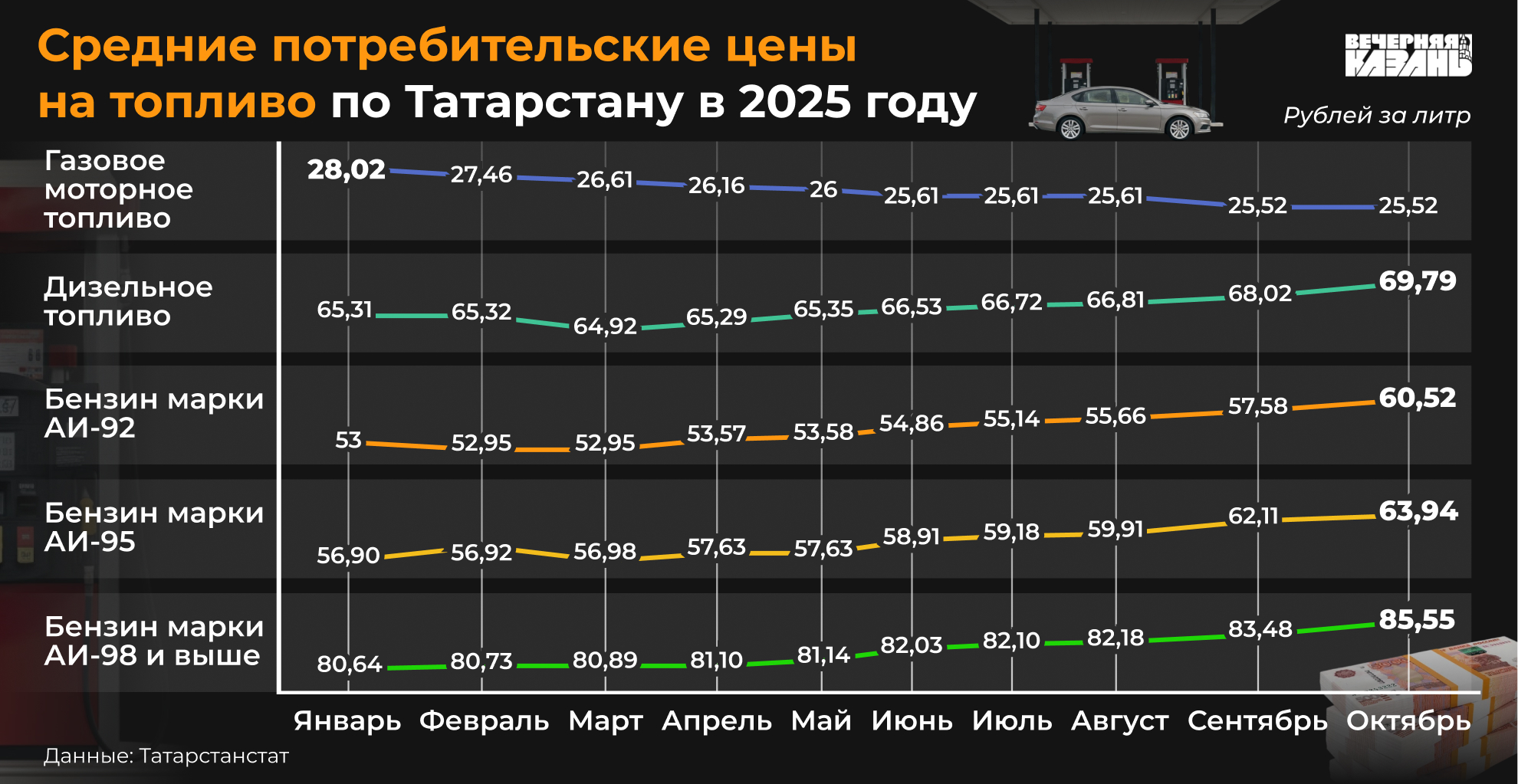 Топливо же подорожало более ощутимо: с января по октябрь бензин марки АИ-92 вырос в цене на 14%, АИ-95 — на 12%, а АИ-98 — на 6%. Повышать тарифы перевозчикам не дают ограниченный потребительский спрос и снижение количества заказов.
