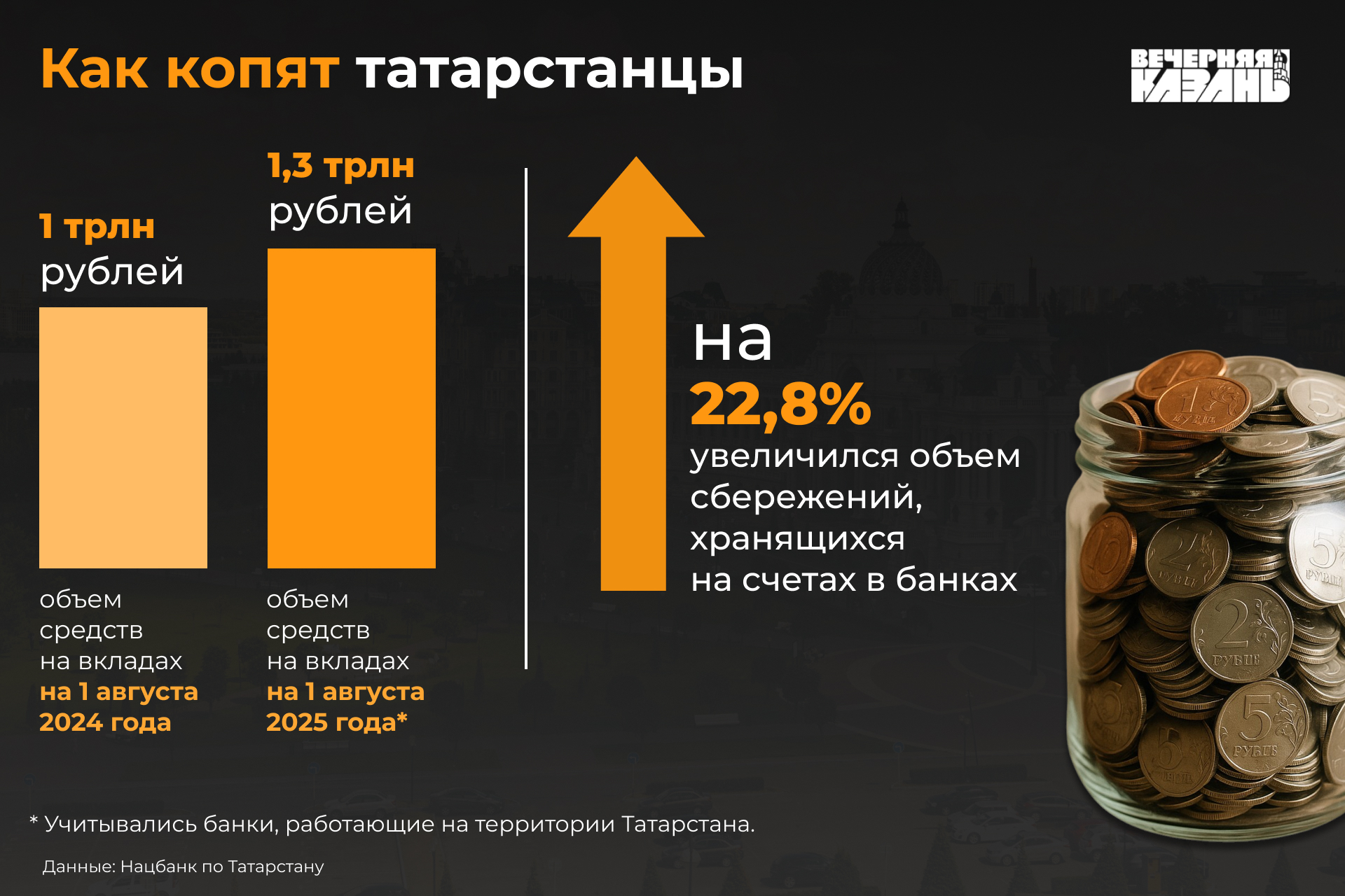 Ранее в Нацбанке Татарстана сообщили «Вечерней Казани», что на 1 августа 2025 года объем вкладов на счетах банков, работающих на территории республики, составил почти 1,3 триллиона рублей. Годом ранее объем вкладов на счетах едва превышал 1 триллион рублей. Таким образом, за год данный показатель вырос на 22,8%.