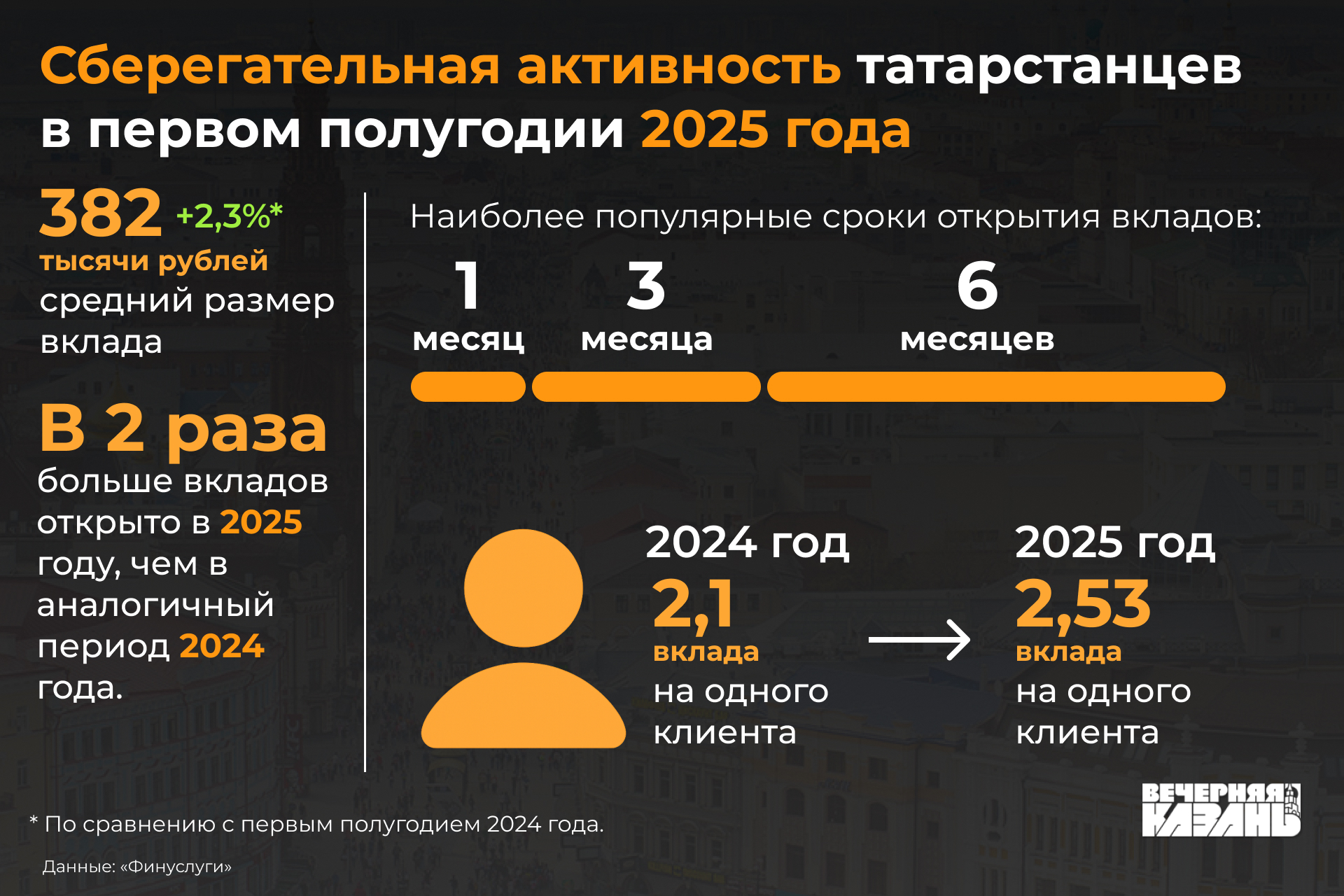 Средний размер вклада жителя Татарстана, по данным «Финуслуг», в августе составил 382 тысячи рублей, что на 12,6% ниже, чем в целом по стране, но немного выше, чем показатель за первое полугодие 2025 года по Татарстану (+2,3%). В пресс-службе маркетплейса добавили, что татарстанцы открывали вклады как в топ-10 банков, так и в менее крупных кредитных организациях.