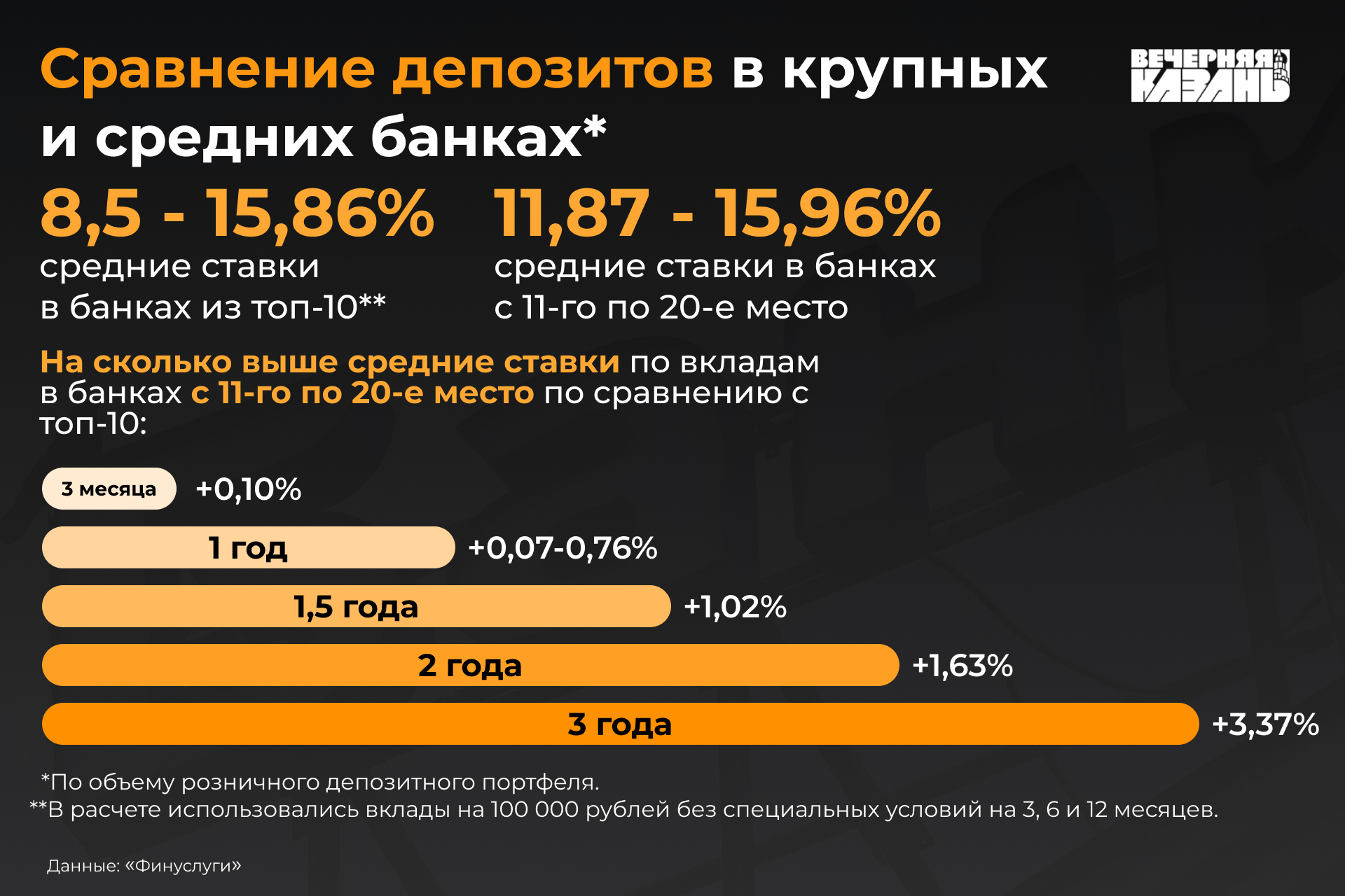 Заведующий кафедрой института управления, экономики и финансов КФУ Игорь Кох пояснил, что если для вкладчика не принципиальны продвинутое обслуживание и наличие риска банкротства банка (если сумма вклада не превышает 1,4 миллиона рублей), то вклад в небольшом банке с точки зрения процентной ставки выгоднее, чем в крупном.