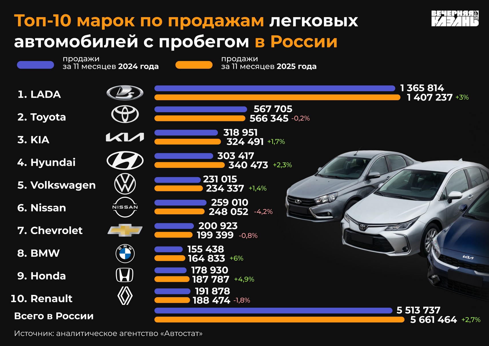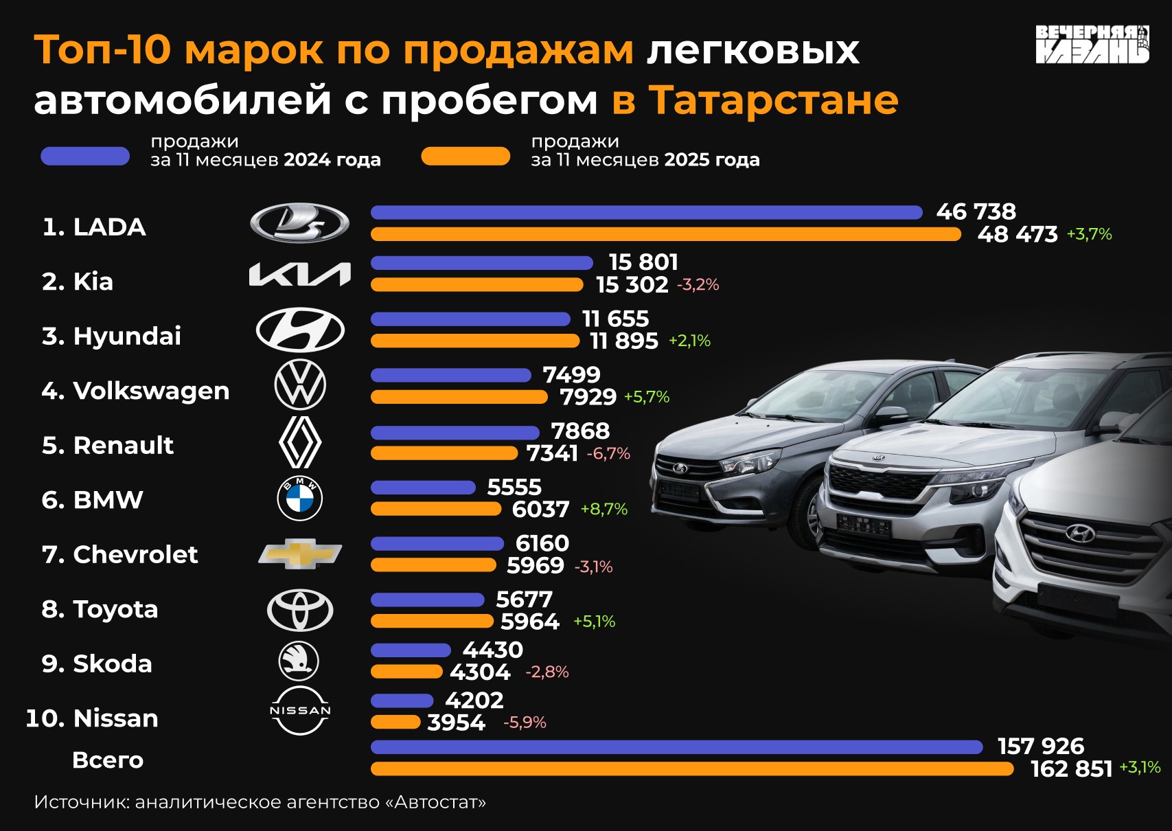 Цифры продаж Volkswagen (он 4-й) едва ли не вдвое меньше того же Hyundai. Он по сравнению с прошлым годом также немного нарастил продажи: на 5,7%. В сопоставимых объемах с ним татарстанцы покупали в этом году и бэушные Renault (7341). Динамика у этой марки отрицательная (по итогам 11 месяцев минус 6,7%). На шестом месте премиальный бренд BMW — 6037 авто, что на 8,7% больше, чем годом ранее. Почти столько же было продано и Chevrolet , покупали эти иномарки меньше (на 3,1%), чем ранее.