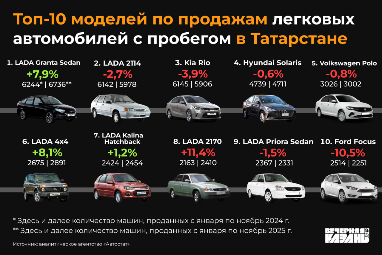 Обладателями 5,66 миллиона легковых автомобилей с пробегом стали жители нашей страны за 11 месяцев этого года — это на 2,7% больше, чем в январе – ноябре прошлого года. В том числе почти 163 тысячи из них купили татарстанцы, улучшив свой результат 2024 года на 3,1%. Такие данные приводит аналитическое агентство «Автостат».